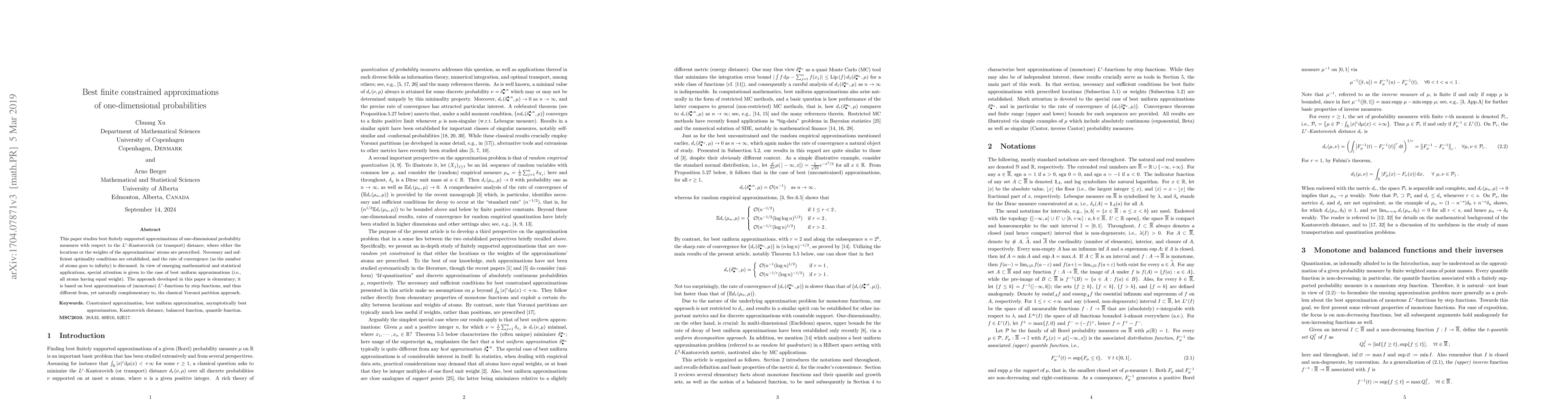 This paper studies best finitely supported approximations of one-dimensional probability measures with respect to the $L^r$-Kantorovich (or transport) distance, where either the locations or the weights of the approximations' atoms are prescribed. Necessary and sufficient optimality conditions are established, and the rate of convergence (as the number of atoms goes to infinity) is discussed. In view of emerging mathematical and statistical applications, special attention is given to the case of best uniform approximations (i.e., all atoms having equal weight). The approach developed in this paper is elementary; it is based on best approximations of (monotone) $L^r$-functions by step functions, and thus different from, yet naturally complementary to, the classical Voronoi partition approach.