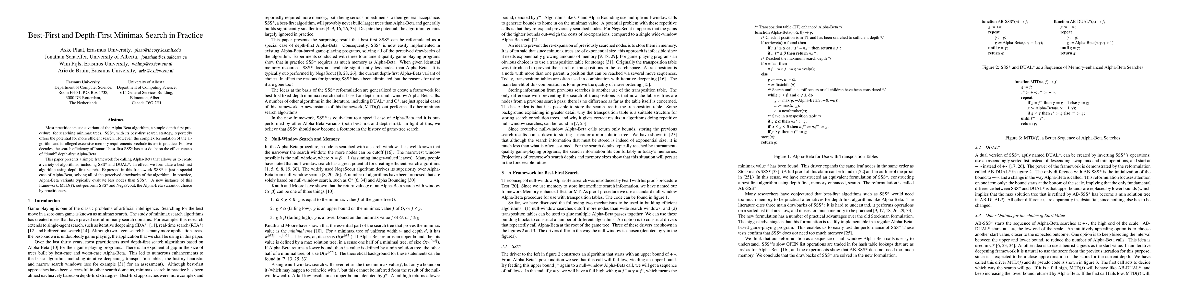 This paper compares the efficiency of best-first search algorithms like SSS* with traditional depth-first Alpha-Beta minimax search, demonstrating that Alpha-Beta variants often evaluate fewer nodes in practice. The authors propose a new framework called MTD(f) that outperforms SSS* and NegaScout.