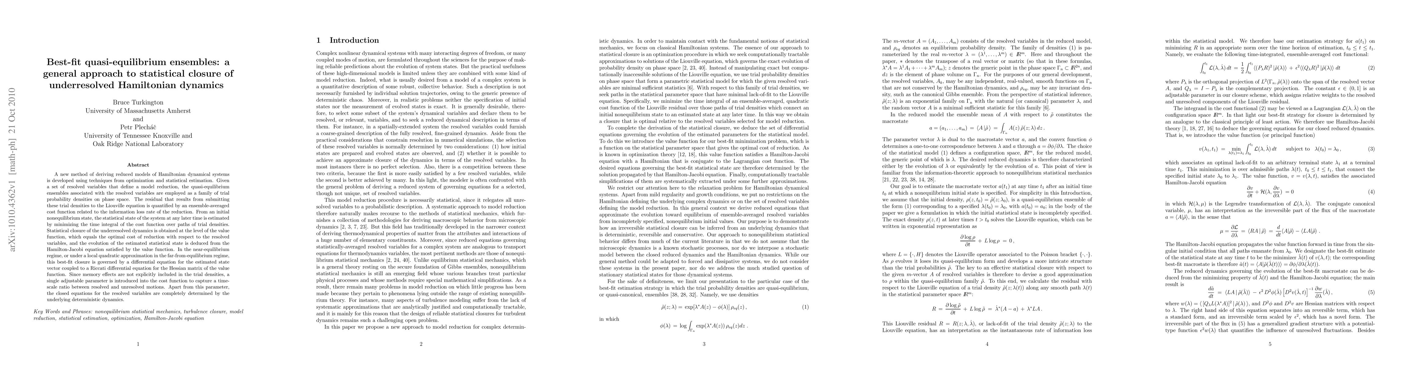 A new method of deriving reduced models of Hamiltonian dynamical systems is developed using techniques from optimization and statistical estimation. Given a set of resolved variables that define a model reduction, the quasi-equilibrium ensembles associated with the resolved variables are employed as a family of trial probability densities on phase space. The residual that results from submitting these trial densities to the Liouville equation is quantified by an ensemble-averaged cost function related to the information loss rate of the reduction. From an initial nonequilibrium state, the statistical state of the system at any later time is estimated by minimizing the time integral of the cost function over paths of trial densities. Statistical closure of the underresolved dynamics is obtained at the level of the value function, which equals the optimal cost of reduction with respect to the resolved variables, and the evolution of the estimated statistical state is deduced from the Hamilton-Jacobi equation satisfied by the value function. In the near-equilibrium regime, or under a local quadratic approximation in the far-from-equilibrium regime, this best-fit closure is governed by a differential equation for the estimated state vector coupled to a Riccati differential equation for the Hessian matrix of the value function. Since memory effects are not explicitly included in the trial densities, a single adjustable parameter is introduced into the cost function to capture a time-scale ratio between resolved and unresolved motions. Apart from this parameter, the closed equations for the resolved variables are completely determined by the underlying deterministic dynamics.