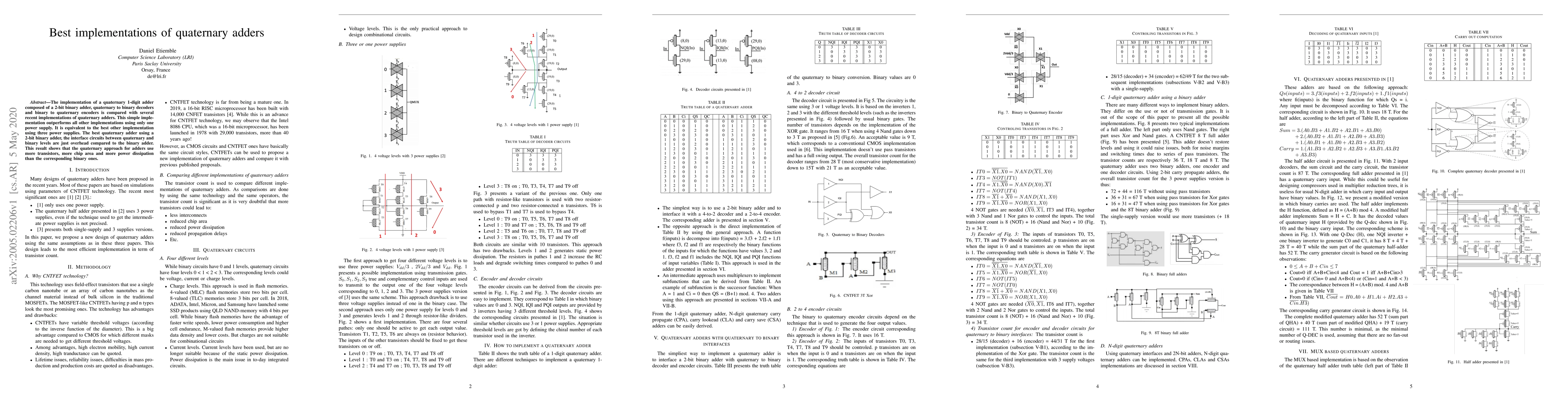 The implementation of a quaternary 1-digit adder composed of a 2-bit binary adder, quaternary to binary decoders and binary to quaternary encoders is compared with several recent implementations of quaternary adders. This simple implementation outperforms all other implementations using only one power supply. It is equivalent to the best other implementation using three power supplies. The best quaternary adder using a 2-bit binary adder, the interface circuits between quaternary and binary levels are just overhead compared to the binary adder. This result shows that the quaternary approach for adders use more transistors, more chip area and more power dissipation than the corresponding binary ones.