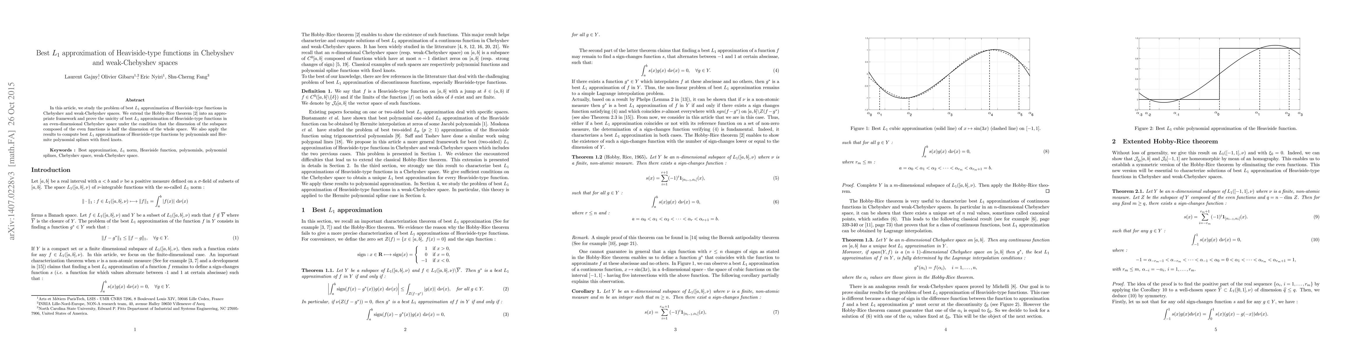 This paper investigates the best $L_1$ approximation of Heaviside-type functions within Chebyshev and weak-Chebyshev spaces, extending the Hobby-Rice theorem and proving the uniqueness of such approximations in even-dimensional Chebyshev spaces under specific conditions. It also applies these findings to compute optimal approximations using polynomials and Hermite polynomial splines.