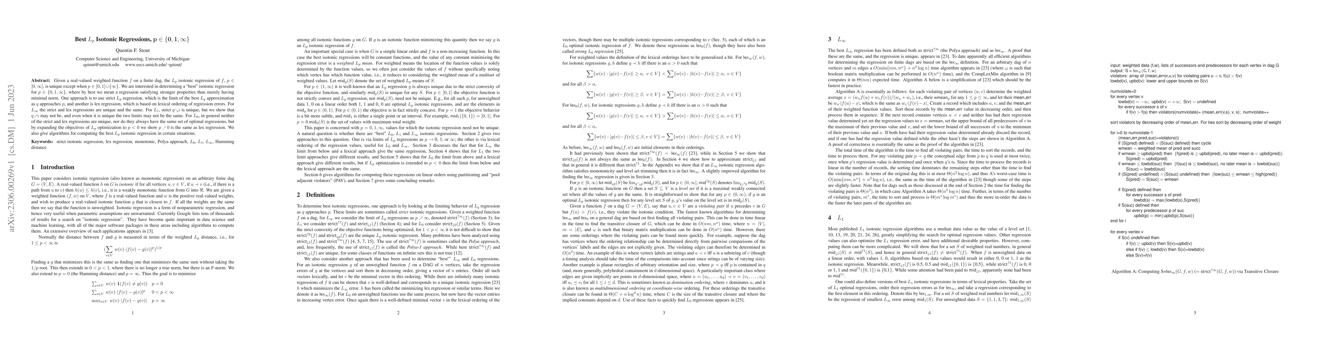 This paper explores the best $L_p$ isotonic regressions for $p \in \{0, 1, \infty\}$, comparing strict $L_p$ regression and lex regression. It finds that while $L_\infty$ regressions are unique and identical for both methods, $L_1$ and $L_0$ regressions exhibit differences, especially when considering limits as $q$ approaches $p$. Algorithms for computing optimal regressions are also provided.