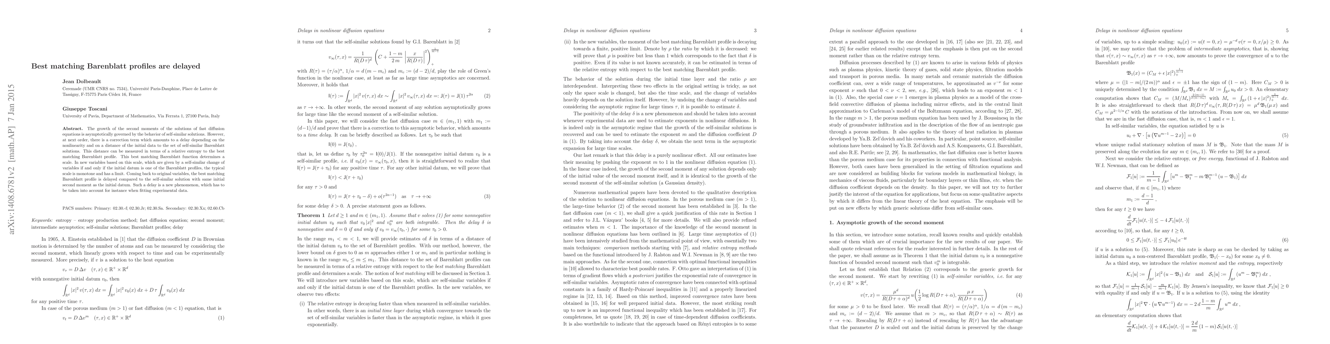 The growth of the second moments of the solutions of fast diffusion equations is asymptotically governed by the behavior of self-similar solutions. However, at next order, there is a correction term which amounts to a delay depending on the nonlinearity and on a distance of the initial data to the set of self-similar Barenblatt solutions. This distance can be measured in terms of a relative entropy to the best matching Barenblatt profile. This best matching Barenblatt function determines a scale. In new variables based on this scale, which are given by a self-similar change of variables if and only if the initial datum is one of the Barenblatt profiles, the typical scale is monotone and has a li