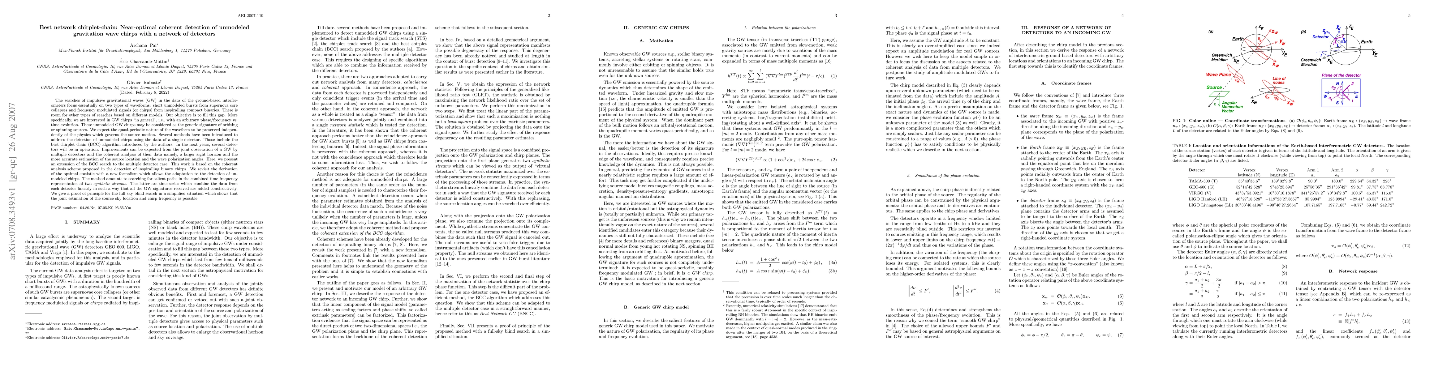 The searches of impulsive gravitational waves (GW) in the data of the ground-based interferometers focus essentially on two types of waveforms: short unmodeled bursts and chirps from inspiralling compact binaries. There is room for other types of searches based on different models. Our objective is to fill this gap. More specifically, we are interested in GW chirps with an arbitrary phase/frequency vs. time evolution. These unmodeled GW chirps may be considered as the generic signature of orbiting/spinning sources. We expect quasi-periodic nature of the waveform to be preserved independent of the physics which governs the source motion. Several methods have been introduced to address the detection of unmodeled chirps using the data of a single detector. Those include the best chirplet chain (BCC) algorithm introduced by the authors. In the next years, several detectors will be in operation. The joint coherent analysis of GW by multiple detectors can improve the sight horizon, the estimation of the source location and the wave polarization angles. Here, we extend the BCC search to the multiple detector case. The method amounts to searching for salient paths in the combined time-frequency representation of two synthetic streams. The latter are time-series which combine the data from each detector linearly in such a way that all the GW signatures received are added constructively. We give a proof of principle for the full sky blind search in a simplified situation which shows that the joint estimation of the source sky location and chirp frequency is possible.
