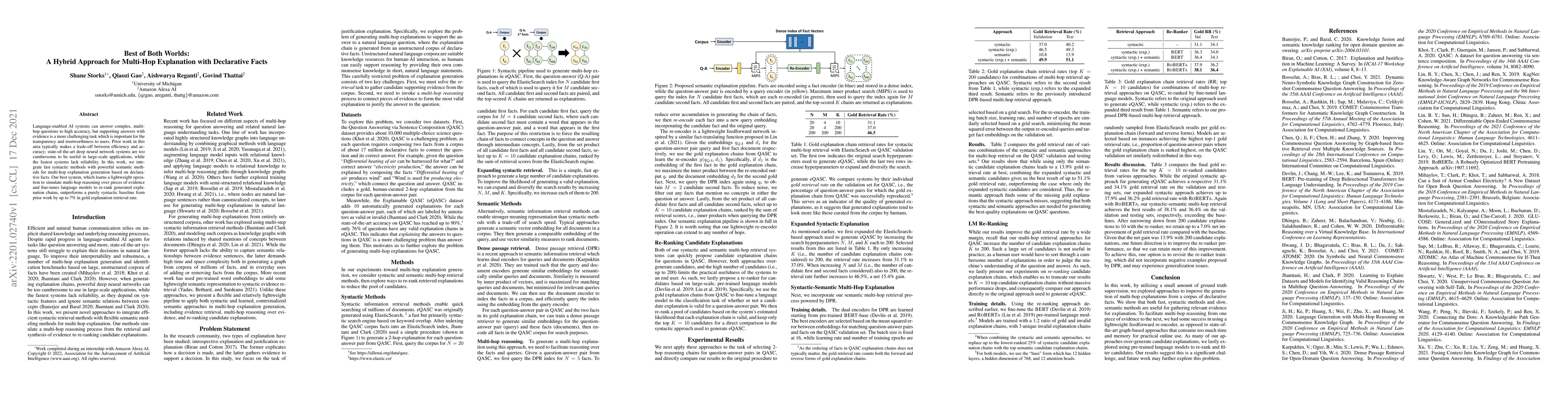 Language-enabled AI systems can answer complex, multi-hop questions to high accuracy, but supporting answers with evidence is a more challenging task which is important for the transparency and trustworthiness to users. Prior work in this area typically makes a trade-off between efficiency and accuracy; state-of-the-art deep neural network systems are too cumbersome to be useful in large-scale applications, while the fastest systems lack reliability. In this work, we integrate fast syntactic methods with powerful semantic methods for multi-hop explanation generation based on declarative facts. Our best system, which learns a lightweight operation to simulate multi-hop reasoning over pieces of evidence and fine-tunes language models to re-rank generated explanation chains, outperforms a purely syntactic baseline from prior work by up to 7% in gold explanation retrieval rate.