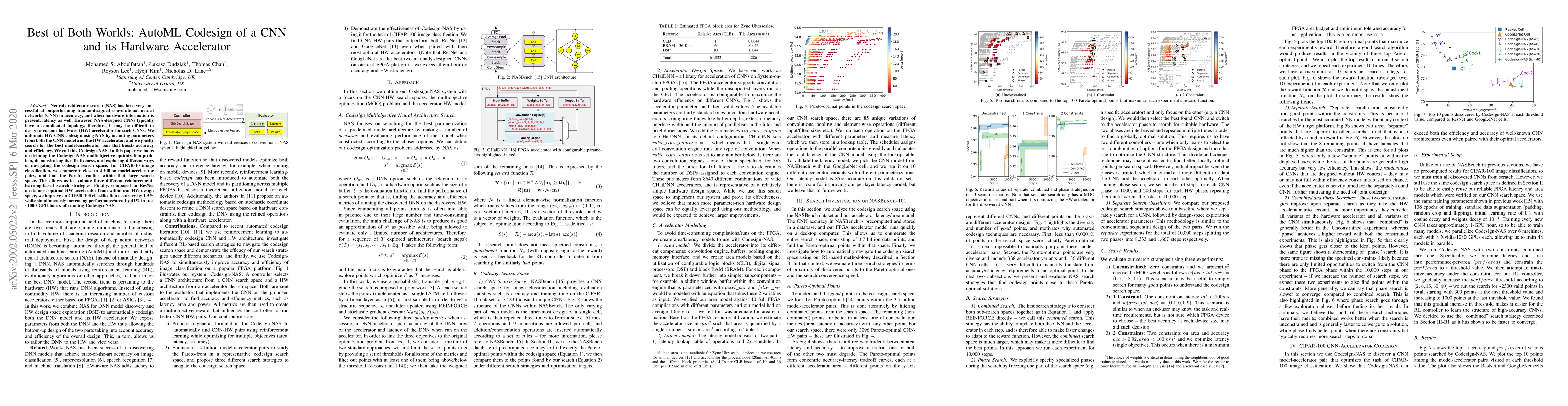 This paper proposes Codesign-NAS, an automated method for jointly optimizing both convolutional neural networks (CNN) and their hardware accelerators using neural architecture search (NAS). The approach finds the best model-accelerator pair for improved accuracy and efficiency, achieving a 1.3% accuracy boost on CIFAR-100 and a 41% performance/area improvement compared to optimal ResNet on its best hardware.