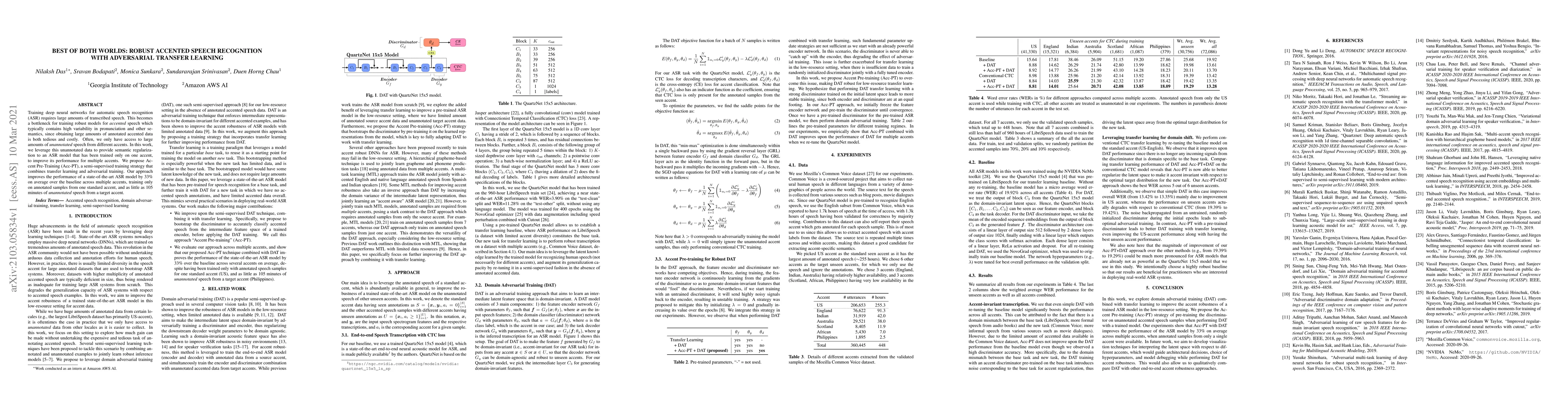 Training deep neural networks for automatic speech recognition (ASR) requires large amounts of transcribed speech. This becomes a bottleneck for training robust models for accented speech which typically contains high variability in pronunciation and other semantics, since obtaining large amounts of annotated accented data is both tedious and costly. Often, we only have access to large amounts of unannotated speech from different accents. In this work, we leverage this unannotated data to provide semantic regularization to an ASR model that has been trained only on one accent, to improve its performance for multiple accents. We propose Accent Pre-Training (Acc-PT), a semi-supervised training strategy that combines transfer learning and adversarial training. Our approach improves the performance of a state-of-the-art ASR model by 33% on average over the baseline across multiple accents, training only on annotated samples from one standard accent, and as little as 105 minutes of unannotated speech from a target accent.