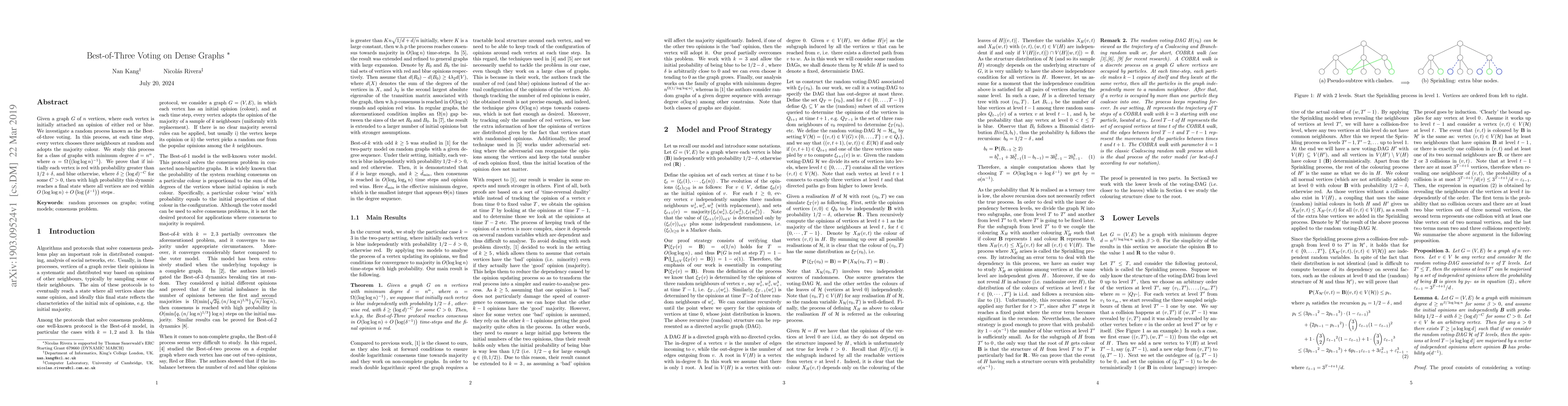 This research paper examines a 'Best-of-three voting' process on dense graphs, where vertices adopt the majority color of their randomly chosen neighbors. It proves that with high probability, all vertices will converge to the same color, red, within a logarithmic number of steps, given certain initial conditions and graph density.