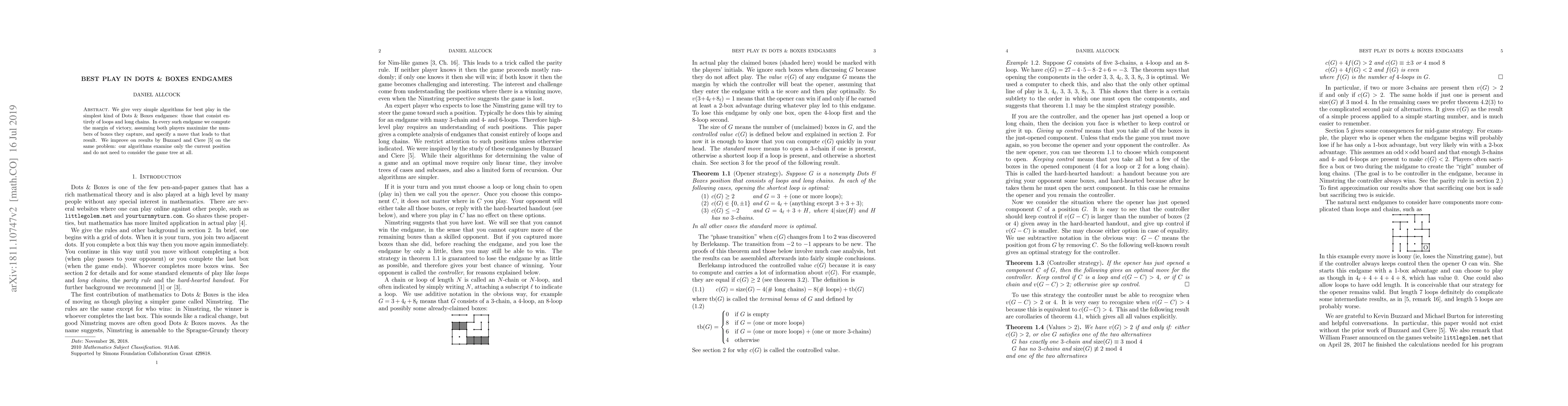 This paper presents simple algorithms for optimal play in Dots and Boxes endgames consisting of loops and chains, computing the margin of victory without exploring the game tree, and improving upon previous results.