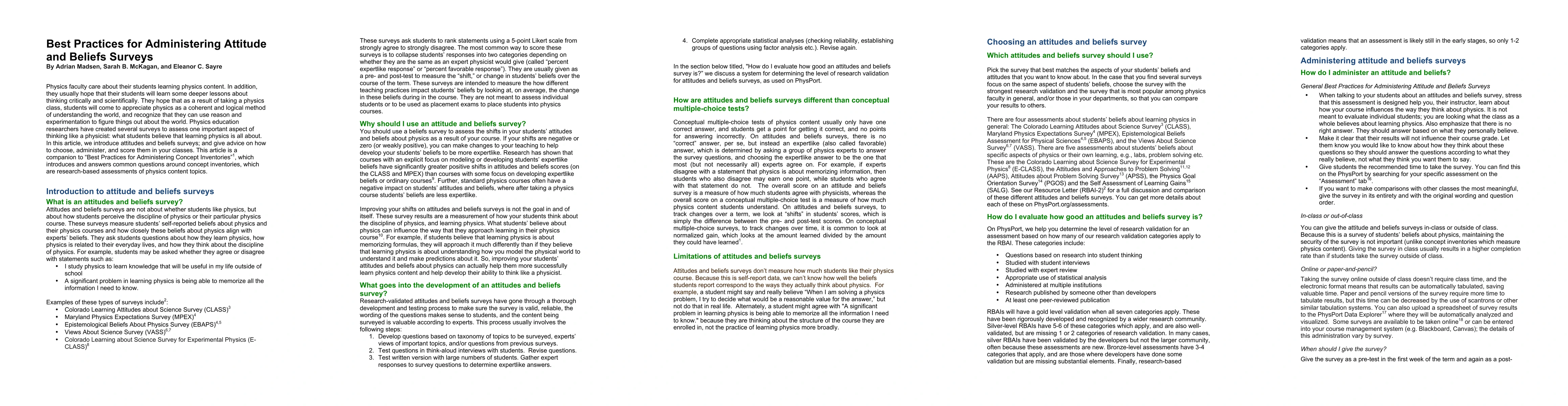 This paper provides guidelines for physics educators on selecting, implementing, and scoring attitude and beliefs surveys to assess students' understanding of physics as a logical, reason-based approach to understanding the world. It complements another article on administering concept inventories for physics content knowledge.