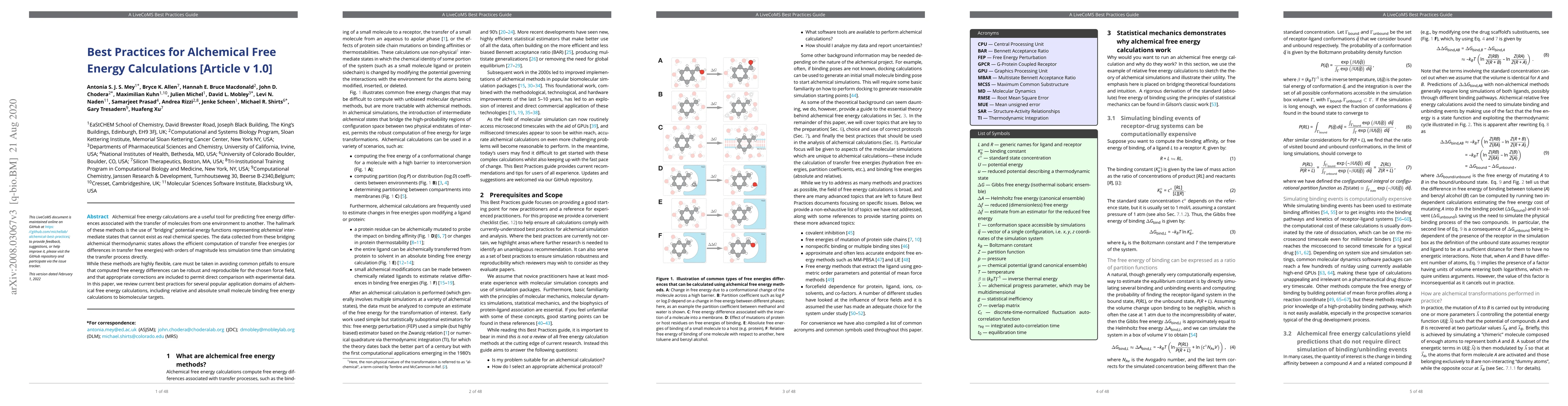 The paper reviews best practices for alchemical free energy calculations, focusing on popular application domains such as relative and absolute small molecule binding free energy calculations to biomolecular targets.