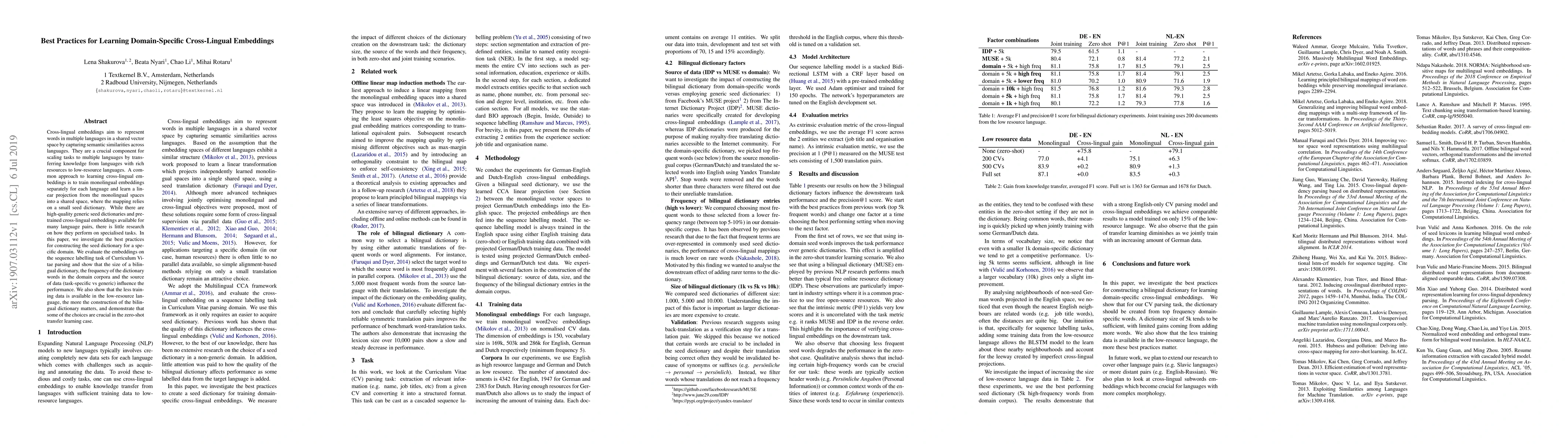 Cross-lingual embeddings aim to represent words in multiple languages in a shared vector space by capturing semantic similarities across languages. They are a crucial component for scaling tasks to multiple languages by transferring knowledge from languages with rich resources to low-resource languages. A common approach to learning cross-lingual embeddings is to train monolingual embeddings separately for each language and learn a linear projection from the monolingual spaces into a shared space, where the mapping relies on a small seed dictionary. While there are high-quality generic seed dictionaries and pre-trained cross-lingual embeddings available for many language pairs, there is little research on how they perform on specialised tasks. In this paper, we investigate the best practices for constructing the seed dictionary for a specific domain. We evaluate the embeddings on the sequence labelling task of Curriculum Vitae parsing and show that the size of a bilingual dictionary, the frequency of the dictionary words in the domain corpora and the source of data (task-specific vs generic) influence the performance. We also show that the less training data is available in the low-resource language, the more the construction of the bilingual dictionary matters, and demonstrate that some of the choices are crucial in the zero-shot transfer learning case.