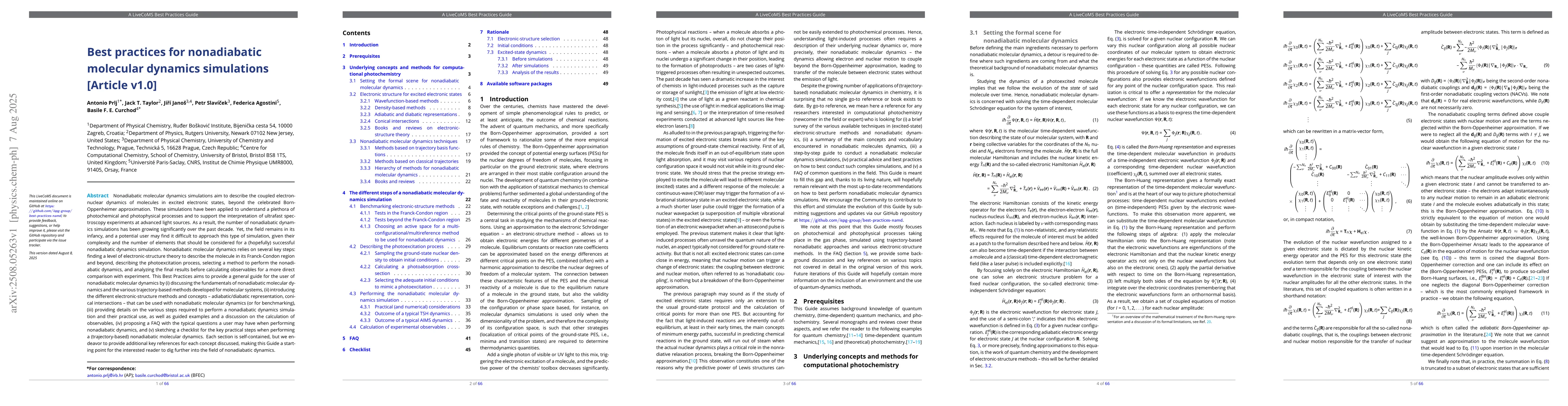 This Best Practices guide offers a comprehensive roadmap for executing nonadiabatic molecular dynamics simulations, detailing fundamental concepts, methodologies, and practical steps. It serves as a valuable resource for researchers seeking to understand and apply these complex simulations to photochemical and photophysical processes.