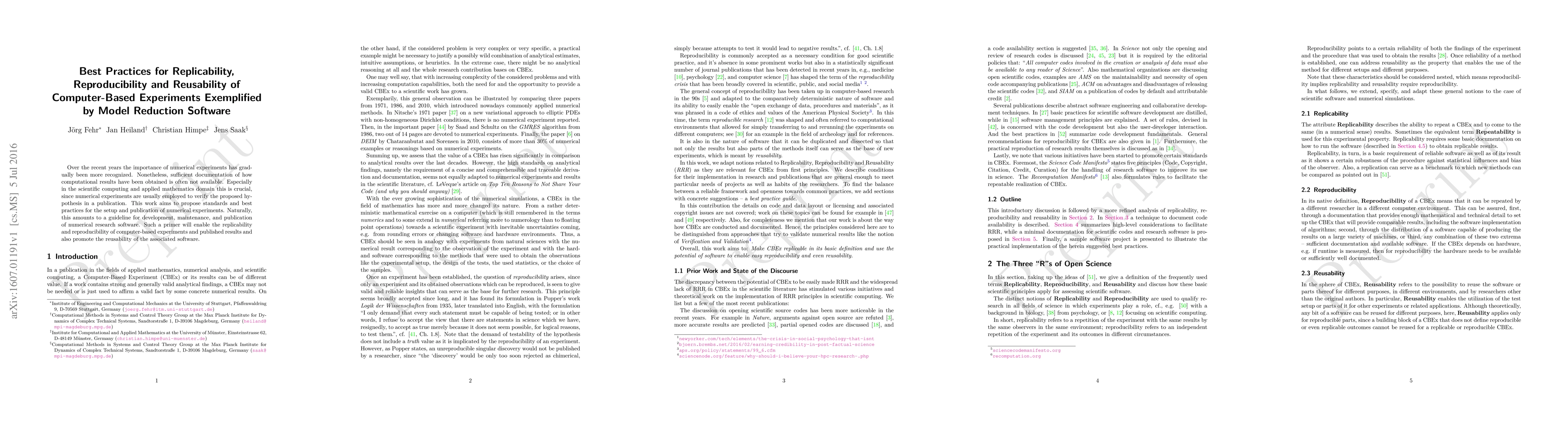 This paper proposes best practices for ensuring replicability, reproducibility, and reusability of computer-based experiments, particularly focusing on model reduction software. It outlines guidelines for the development, maintenance, and publication of numerical research software to enhance the transparency and reliability of computational results in scientific computing.