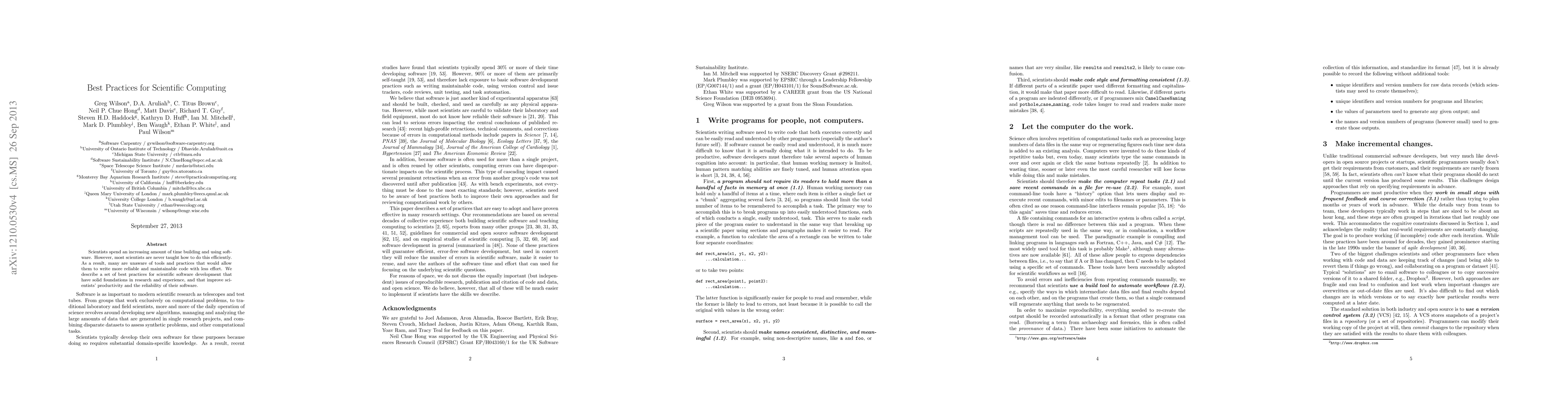 Scientists spend an increasing amount of time building and using software. However, most scientists are never taught how to do this efficiently. As a result, many are unaware of tools and practices that would allow them to write more reliable and maintainable code with less effort. We describe a set of best practices for scientific software development that have solid foundations in research and experience, and that improve scientists' productivity and the reliability of their software.