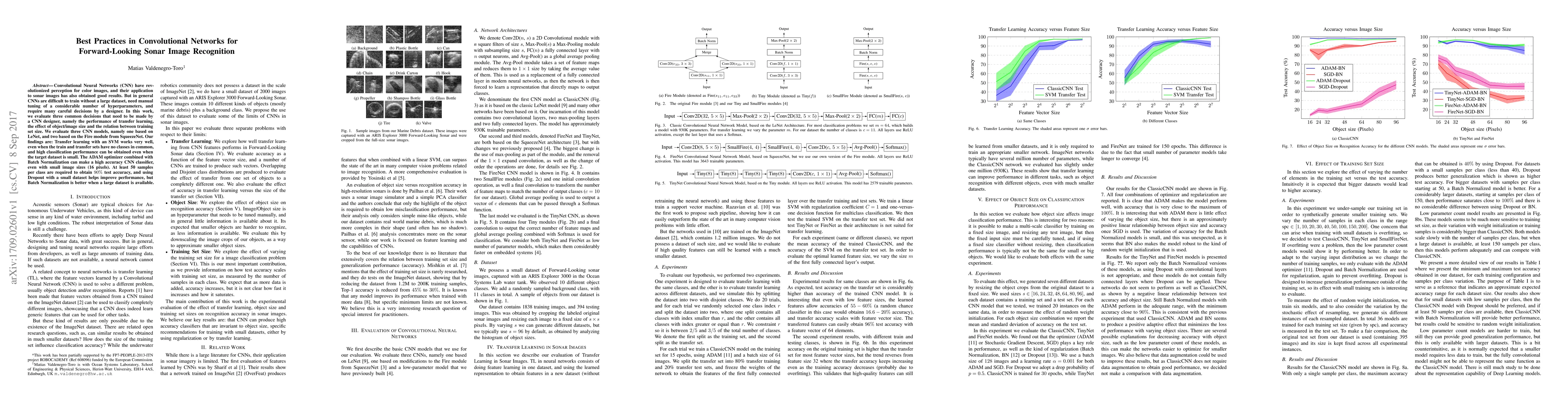Convolutional Neural Networks (CNN) have revolutionized perception for color images, and their application to sonar images has also obtained good results. But in general CNNs are difficult to train without a large dataset, need manual tuning of a considerable number of hyperparameters, and require many careful decisions by a designer. In this work, we evaluate three common decisions that need to be made by a CNN designer, namely the performance of transfer learning, the effect of object/image size and the relation between training set size. We evaluate three CNN models, namely one based on LeNet, and two based on the Fire module from SqueezeNet. Our findings are: Transfer learning with an SVM works very well, even when the train and transfer sets have no classes in common, and high classification performance can be obtained even when the target dataset is small. The ADAM optimizer combined with Batch Normalization can make a high accuracy CNN classifier, even with small image sizes (16 pixels). At least 50 samples per class are required to obtain $90\%$ test accuracy, and using Dropout with a small dataset helps improve performance, but Batch Normalization is better when a large dataset is available.
