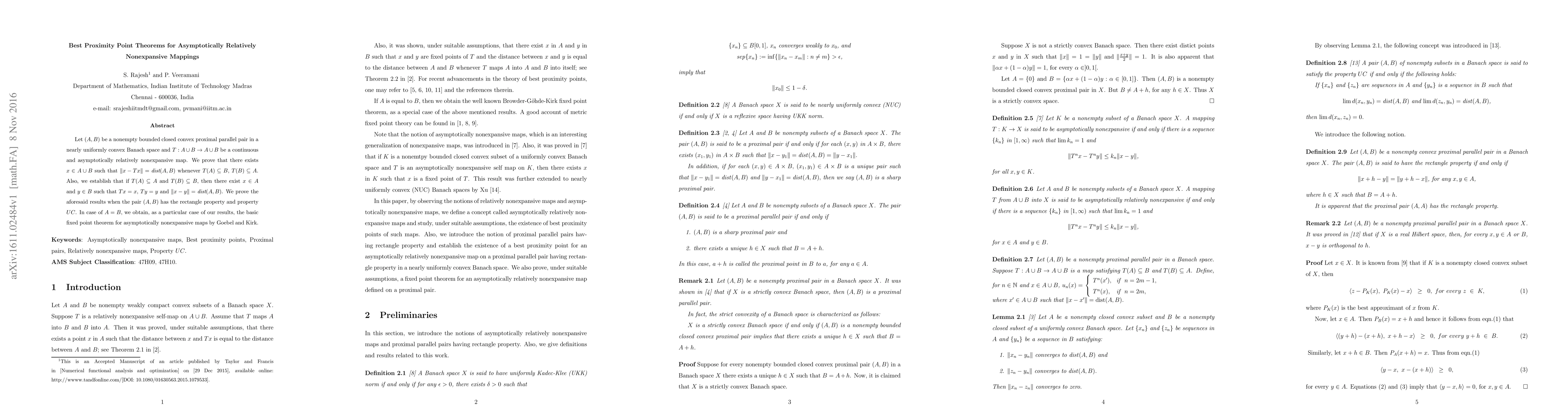 Let $(A, B)$ be a nonempty bounded closed convex proximal parallel pair in a nearly uniformly convex Banach space and $T: A\cup B \rightarrow A\cup B$ be a continuous and asymptotically relatively nonexpansive map. We prove that there exists $x \in A\cup B$ such that $\|x - Tx\| = \emph{dist}(A, B)$ whenever $T(A) \subseteq B$, $T(B) \subseteq A$. Also, we establish that if $T(A) \subseteq A$ and $T(B) \subseteq B$, then there exist $x \in A$ and $y\in B$ such that $Tx = x$, $Ty = y$ and $\|x - y\| = \emph{dist}(A, B)$. We prove the aforesaid results when the pair $(A, B)$ has the rectangle property and property $UC$. In case of $A = B$, we obtain, as a particular case of our results, the basic fixed point theorem for asymptotically nonexpansive maps by Goebel and Kirk.