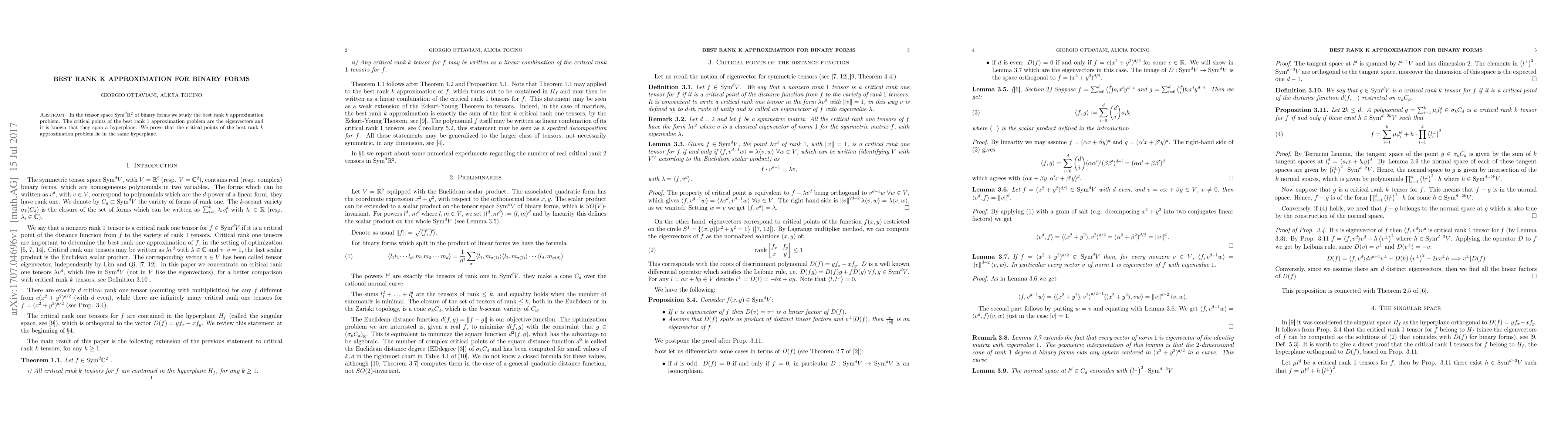 Summary: The paper investigates the best rank k approximation problem in the tensor space of binary forms, proving that the critical points for rank k approximations also lie in the same hyperplane as those for rank 1 approximations. This extends the understanding of the structure of critical points in this tensor space.
