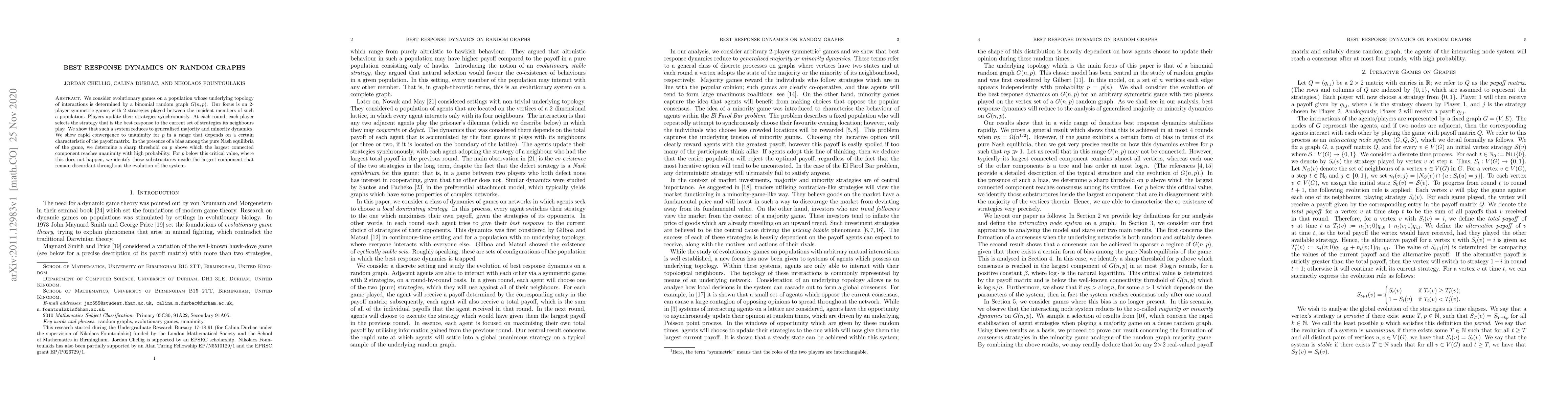 We consider evolutionary games on a population whose underlying topology of interactions is determined by a binomial random graph $G(n,p)$. Our focus is on 2-player symmetric games with 2 strategies played between the incident members of such a population. Players update their strategies synchronously. At each round, each player selects the strategy that is the best response to the current set of strategies its neighbours play. We show that such a system reduces to generalised majority and minority dynamics. We show rapid convergence to unanimity for $p$ in a range that depends on a certain characteristic of the payoff matrix. In the presence of a bias among the pure Nash equilibria of the game, we determine a sharp threshold on $p$ above which the largest connected component reaches unanimity with high probability. For $p$ below this critical value, where this does not happen, we identify those substructures inside the largest component that remain discordant throughout the evolution of the system.