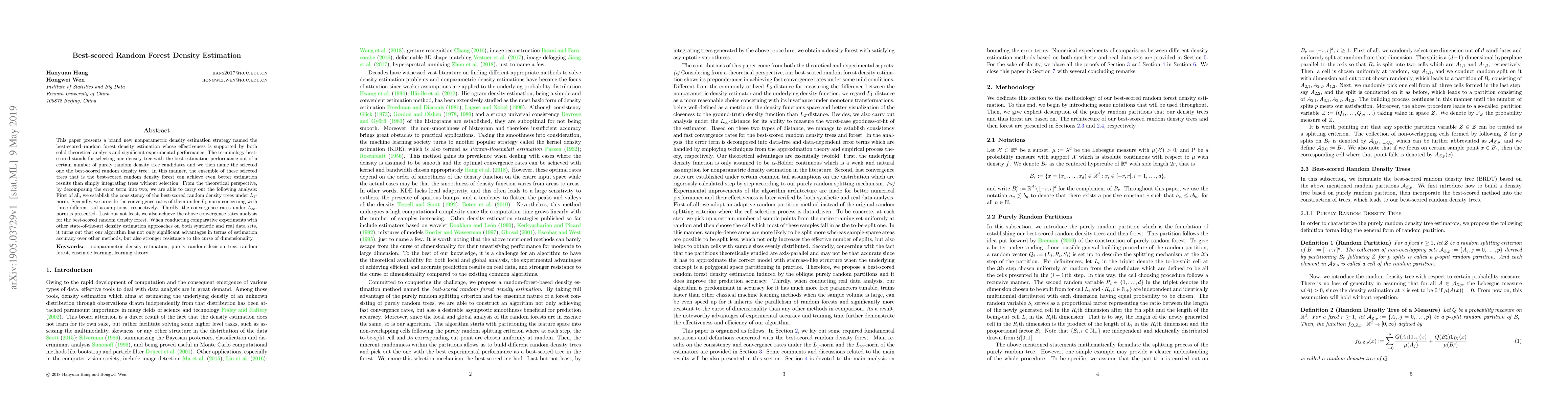 This paper introduces a novel best-scored random forest density estimation method, which selects the most effective density tree from random candidates to form an ensemble, demonstrating superior theoretical consistency and experimental performance compared to other methods. The method shows significant advantages in accuracy and resistance to high-dimensional data.