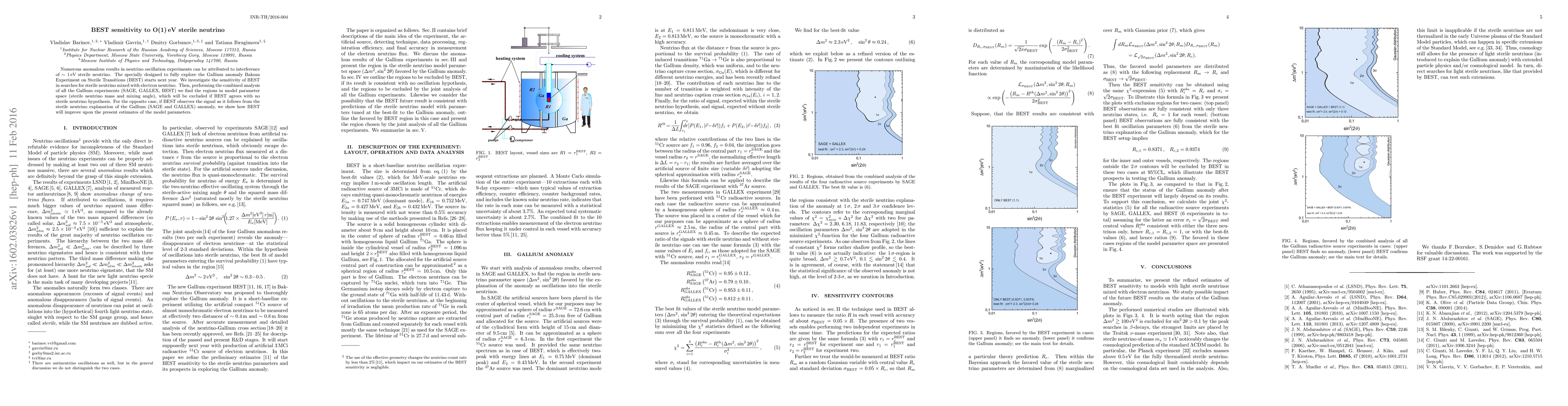 The BEST experiment aims to detect a 1 eV sterile neutrino causing anomalous results in neutrino oscillation experiments. It will set limits on model parameters if no signal is found, or provide new constraints if it observes the expected signal from the Gallium anomaly.