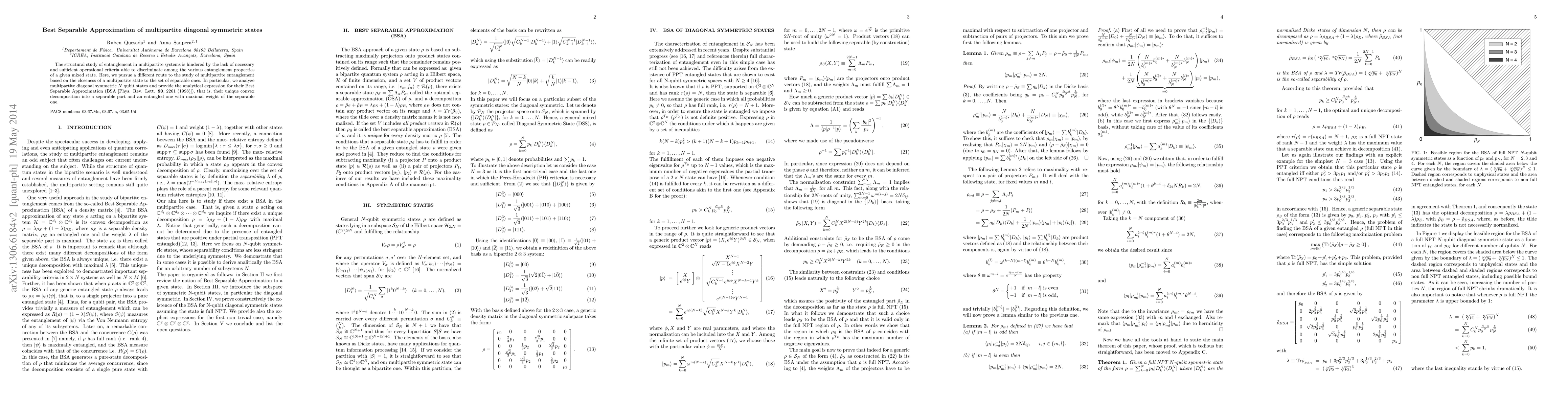 This paper investigates multipartite entanglement by analyzing the Best Separable Approximation (BSA) of multipartite diagonal symmetric N qubit states, providing an analytical expression for their unique convex decomposition into a separable part and an entangled one with maximal separable weight.