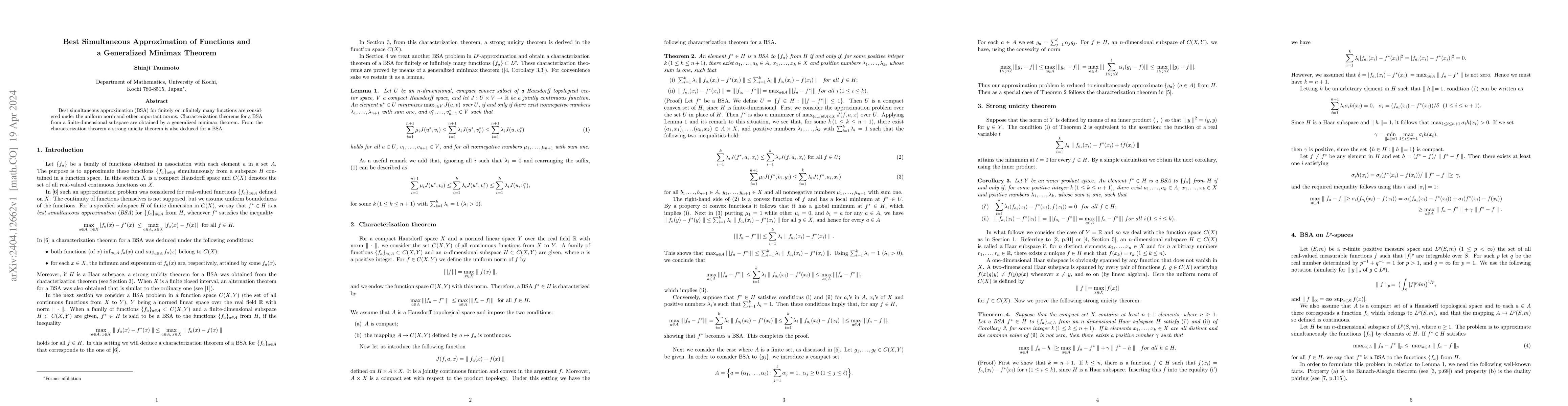 Summary: This paper investigates best simultaneous approximation (BSA) of multiple functions under various norms, deriving characterization theorems using a generalized minimax approach, and proving a strong unicity theorem for BSAs from finite-dimensional subspaces.