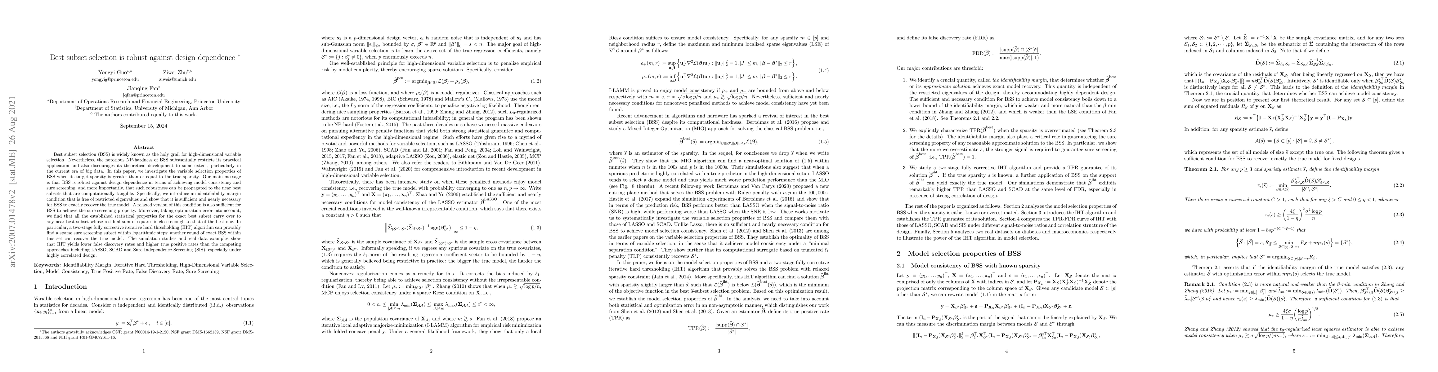 Best subset selection (BSS) is widely known as the holy grail for high-dimensional variable selection. Nevertheless, the notorious NP-hardness of BSS substantially restricts its practical application and also discourages its theoretical development to some extent, particularly in the current era of big data. In this paper, we investigate the variable selection properties of BSS when its target sparsity is greater than or equal to the true sparsity. Our main message is that BSS is robust against design dependence in terms of achieving model consistency and sure screening, and more importantly, that such robustness can be propagated to the near best subsets that are computationally tangible. Specifically, we introduce an identifiability margin condition that is free of restricted eigenvalues and show that it is sufficient and nearly necessary for BSS to exactly recover the true model. A relaxed version of this condition is also sufficient for BSS to achieve the sure screening property. Moreover, taking optimization error into account, we find that all the established statistical properties for the exact best subset carry over to any near best subset whose residual sum of squares is close enough to that of the best one. In particular, a two-stage fully corrective iterative hard thresholding (IHT) algorithm can provably find a sparse sure screening subset within logarithmic steps; another round of exact BSS within this set can recover the true model. The simulation studies and real data examples show that IHT yields lower false discovery rates and higher true positive rates than the competing approaches including LASSO, SCAD and Sure Independence Screening (SIS), especially under highly correlated design.