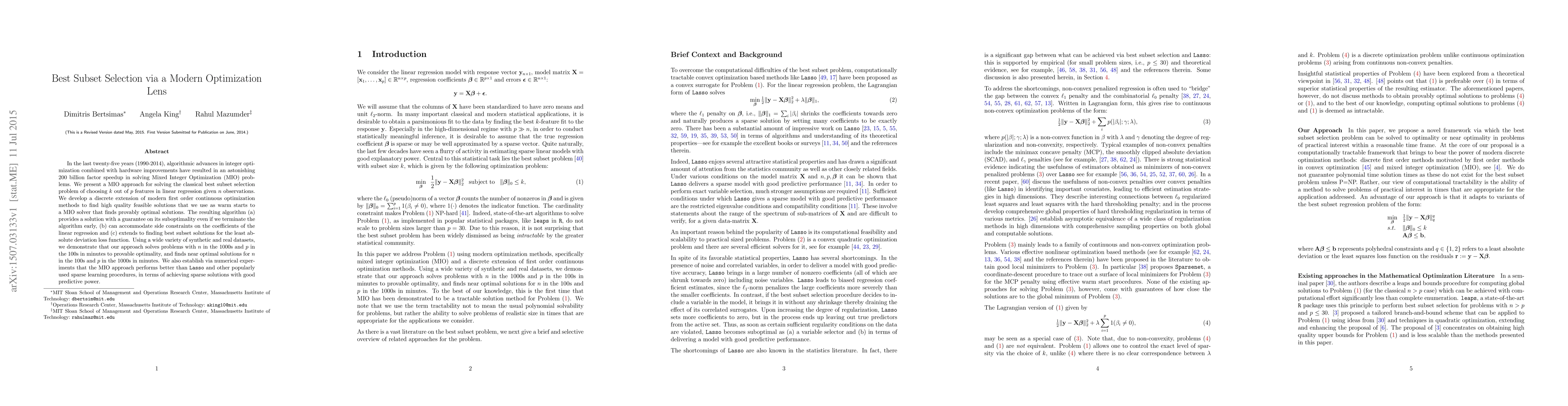 In the last twenty-five years (1990-2014), algorithmic advances in integer optimization combined with hardware improvements have resulted in an astonishing 200 billion factor speedup in solving Mixed Integer Optimization (MIO) problems. We present a MIO approach for solving the classical best subset selection problem of choosing $k$ out of $p$ features in linear regression given $n$ observations. We develop a discrete extension of modern first order continuous optimization methods to find high quality feasible solutions that we use as warm starts to a MIO solver that finds provably optimal solutions. The resulting algorithm (a) provides a solution with a guarantee on its suboptimality even if we terminate the algorithm early, (b) can accommodate side constraints on the coefficients of the linear regression and (c) extends to finding best subset solutions for the least absolute deviation loss function. Using a wide variety of synthetic and real datasets, we demonstrate that our approach solves problems with $n$ in the 1000s and $p$ in the 100s in minutes to provable optimality, and finds near optimal solutions for $n$ in the 100s and $p$ in the 1000s in minutes. We also establish via numerical experiments that the MIO approach performs better than {\texttt {Lasso}} and other popularly used sparse learning procedures, in terms of achieving sparse solutions with good predictive power.