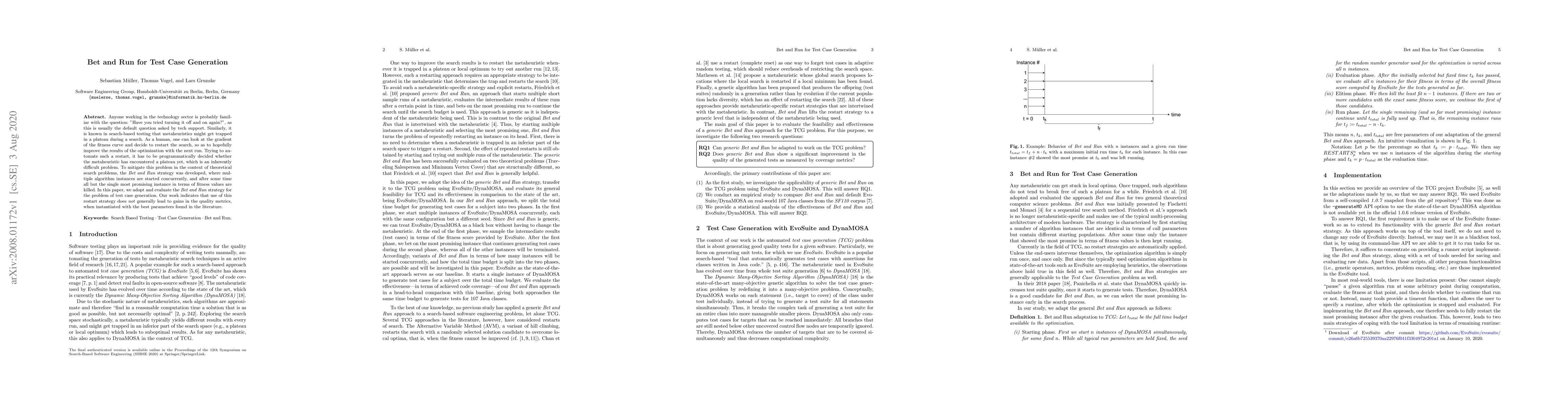 The Bet and Run strategy, which concurrently starts multiple instances of a search algorithm and kills all but the best one, is evaluated for test case generation. Despite its potential to mitigate plateau issues, the study finds that it does not significantly improve quality metrics when using the best parameters from the literature.