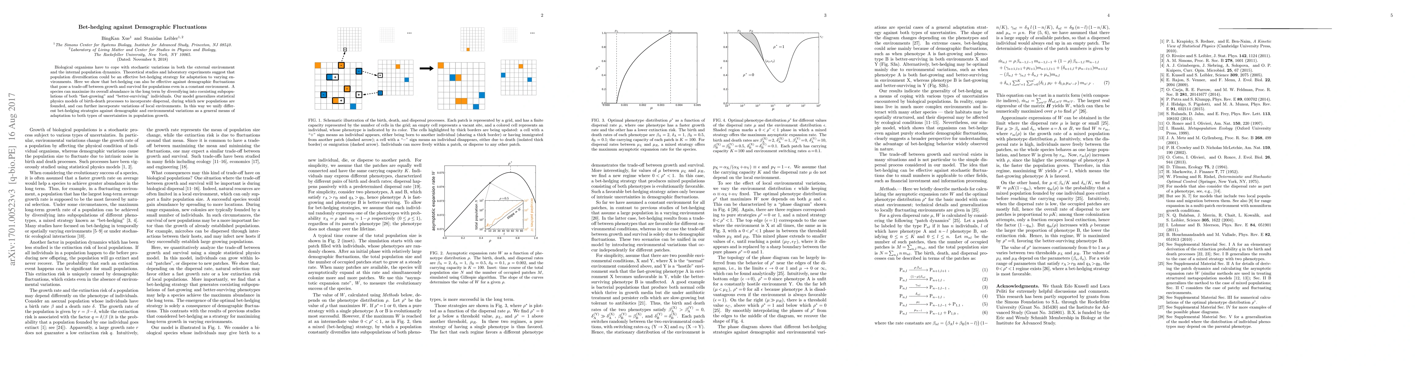 The research uses mathematical modeling and theoretical analysis to show that bet-hedging strategies can be effective against demographic fluctuations, even in a constant environment. It generalizes statistical physics models of birth-death processes to incorporate dispersal and local environment variations, unifying different bet-hedging strategies.