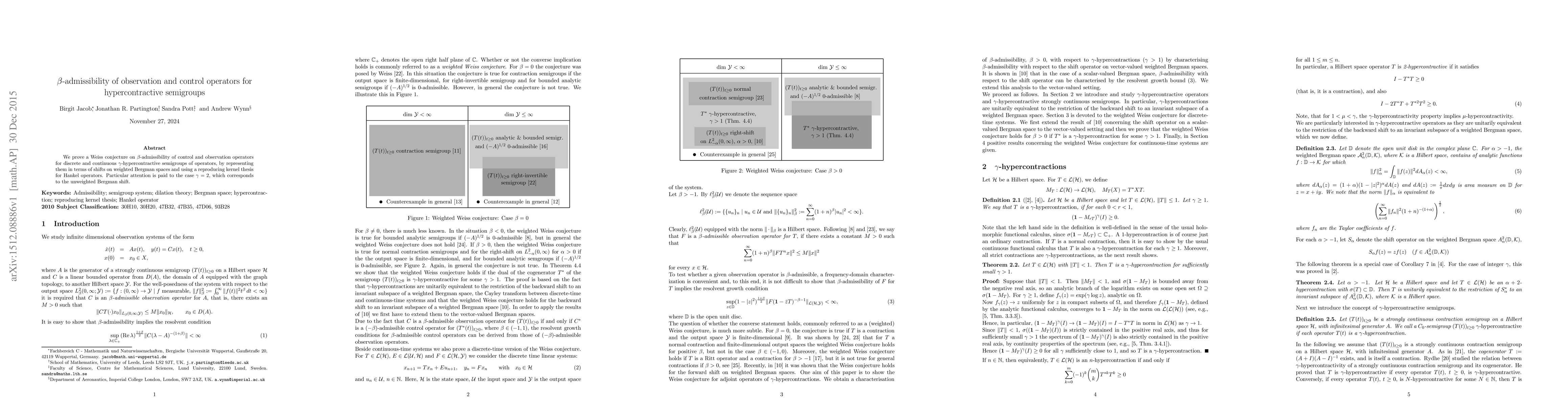 This paper proves a Weiss conjecture regarding the $\beta$-admissibility of control and observation operators for $\gamma$-hypercontractive semigroups, utilizing shifts on weighted Bergman spaces and a reproducing kernel approach for Hankel operators, with special focus on the $\gamma=2$ case.