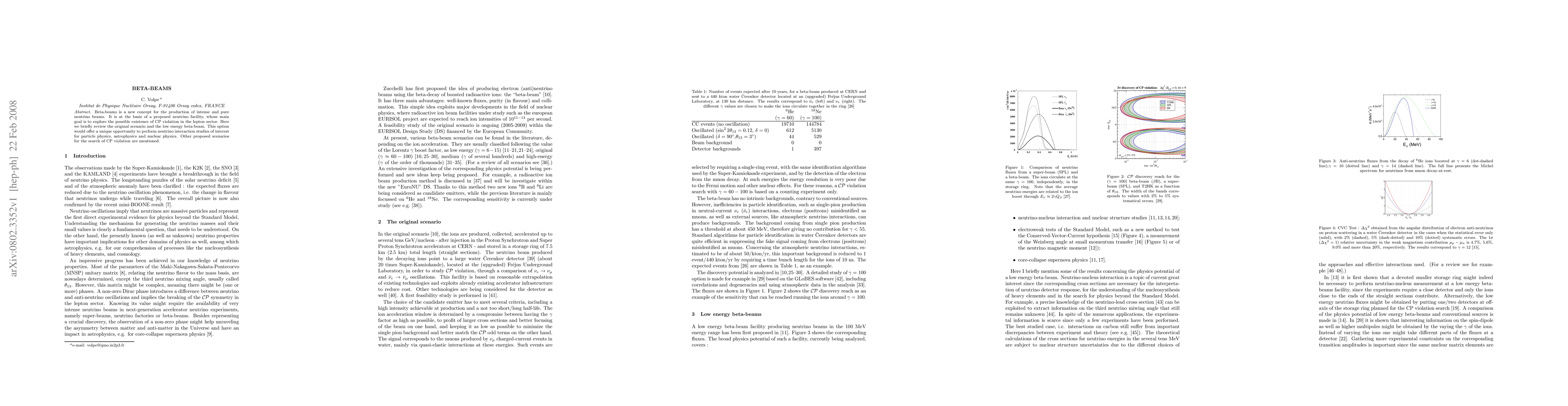 Beta-beams is a new concept for the production of intense and pure neutrino beams. It is at the basis of a proposed neutrino facility, whose main goal is to explore the possible existence of CP violation in the lepton sector. Here we briefly review the original scenario and the low energy beta-beam. This option would offer a unique opportunity to perform neutrino interaction studies of interest for particle physics, astrophysics and nuclear physics. Other proposed scenarios for the search of CP violation are mentioned.