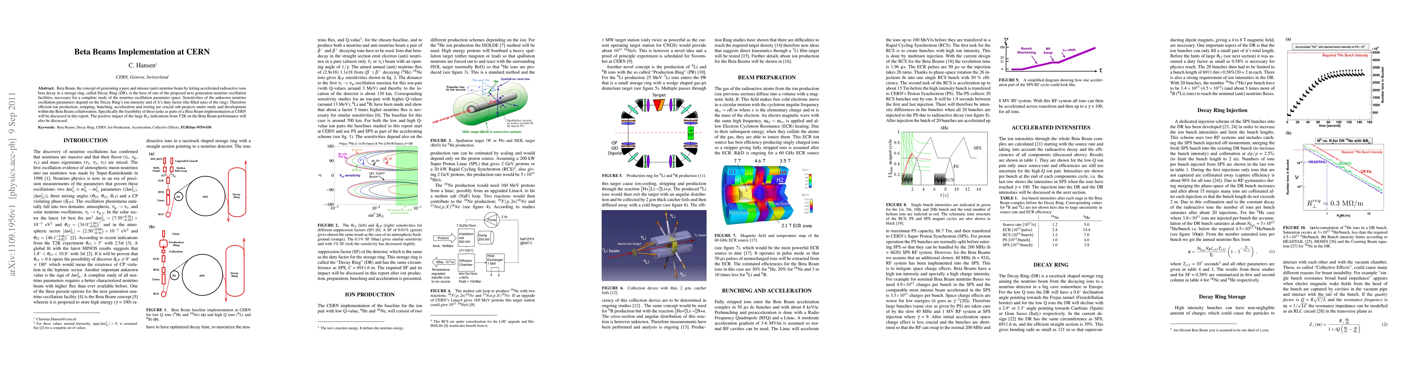 Beta Beam,the concept of generating a pure and intense (anti) neutrino beam by letting accelerated radioactive ions beta decay in a storage ring, called Decay Ring (DR), is the base of one of the proposed next generation neutrino oscillation facilities, necessary for a complete study of the neutrino oscillation parameter space. Sensitivities of the unknown neutrino oscillation parameters depend on the Decay Ring's ion intensity and of it's duty factor (the filled ratio of the ring). Therefore efficient ion production, stripping, bunching, acceleration and storing are crucial sub-projects under study and development within the Beta Beam collaboration. Specifically the feasibility of these tasks as parts of a Beta Beam implementation at CERN will be discussed in this report. The positive impact of the large {\theta}13 indications from T2K on the Beta Beam performance will also be discussed.