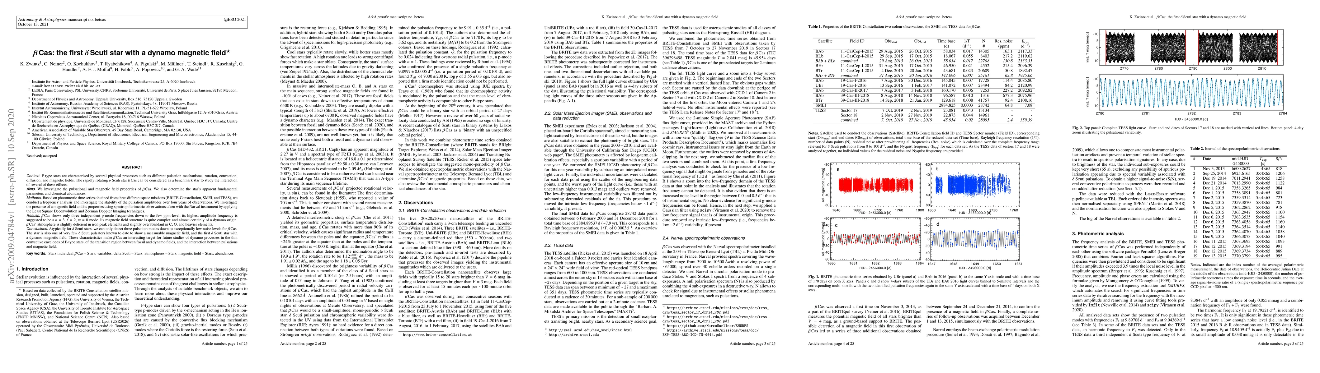 Beta Cas is a delta Scuti star exhibiting only three independent p-mode pulsations and is the first known to have a dynamo magnetic field. Spectropolarimetric observations reveal a complex magnetic field structure, while chemical abundances show slight deficiencies in iron peak elements and enhancements in C, O, and heavier elements.