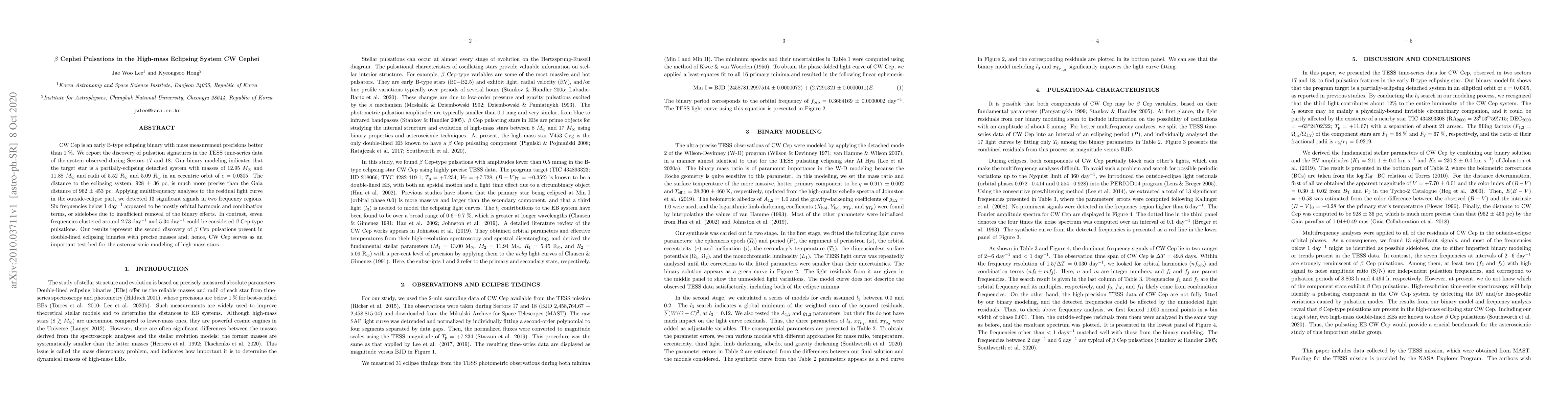 CW Cephei, an early B-type eclipsing binary, has been identified as a system with $\beta$ Cephei pulsations, as evidenced by TESS data. The system's two stars, with masses of 12.95 $M_\odot$ and 11.88 $M_\odot$, provide a precise test-bed for asteroseismic modeling of high-mass stars.
