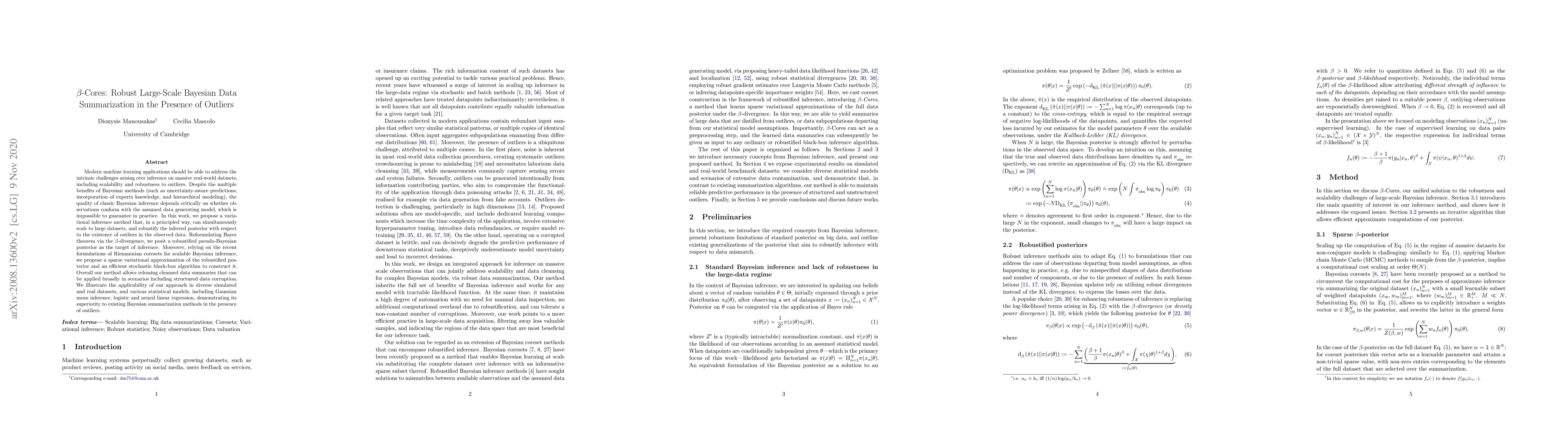 Modern machine learning applications should be able to address the intrinsic challenges arising over inference on massive real-world datasets, including scalability and robustness to outliers. Despite the multiple benefits of Bayesian methods (such as uncertainty-aware predictions, incorporation of experts knowledge, and hierarchical modeling), the quality of classic Bayesian inference depends critically on whether observations conform with the assumed data generating model, which is impossible to guarantee in practice. In this work, we propose a variational inference method that, in a principled way, can simultaneously scale to large datasets, and robustify the inferred posterior with respect to the existence of outliers in the observed data. Reformulating Bayes theorem via the $\beta$-divergence, we posit a robustified pseudo-Bayesian posterior as the target of inference. Moreover, relying on the recent formulations of Riemannian coresets for scalable Bayesian inference, we propose a sparse variational approximation of the robustified posterior and an efficient stochastic black-box algorithm to construct it. Overall our method allows releasing cleansed data summaries that can be applied broadly in scenarios including structured data corruption. We illustrate the applicability of our approach in diverse simulated and real datasets, and various statistical models, including Gaussian mean inference, logistic and neural linear regression, demonstrating its superiority to existing Bayesian summarization methods in the presence of outliers.