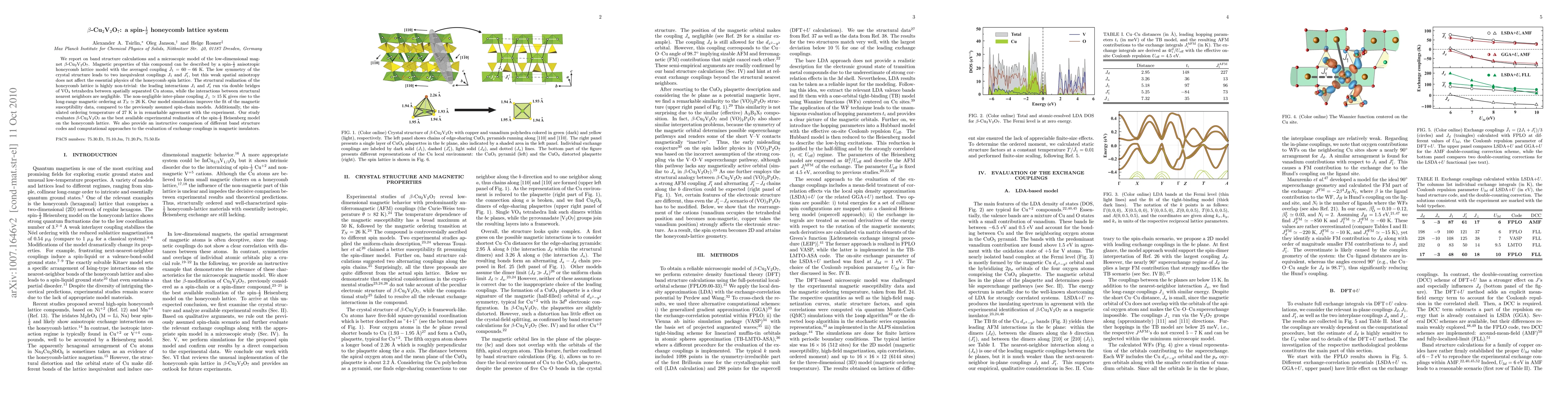 The research paper presents band structure calculations and a microscopic model for the magnetic compound beta-Cu2V2O7, revealing it as an ideal realization of a spin-1/2 Heisenberg model on a honeycomb lattice. The study finds two inequivalent couplings due to low crystal symmetry, with non-negligible inter-plane coupling causing long-range magnetic ordering at 26 K. Model simulations accurately describe magnetic susceptibility data, outperforming previous spin-chain models.
