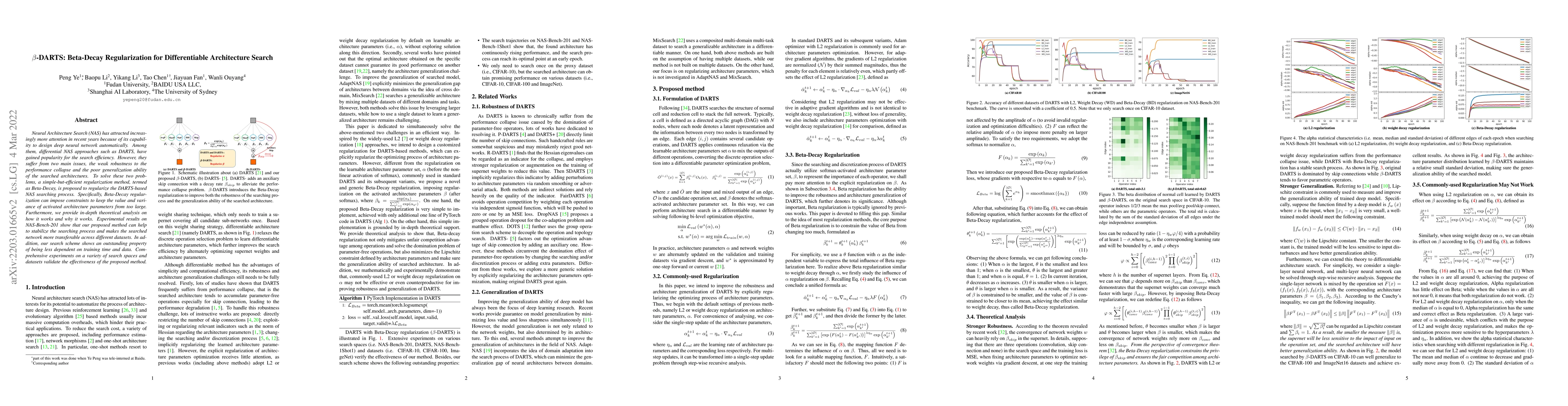 A new regularization method called Beta-Decay is proposed to improve the stability and generalization of Neural Architecture Search (NAS) methods like DARTS. Experimental results show that it helps stabilize the searching process and improves transferability across different datasets.