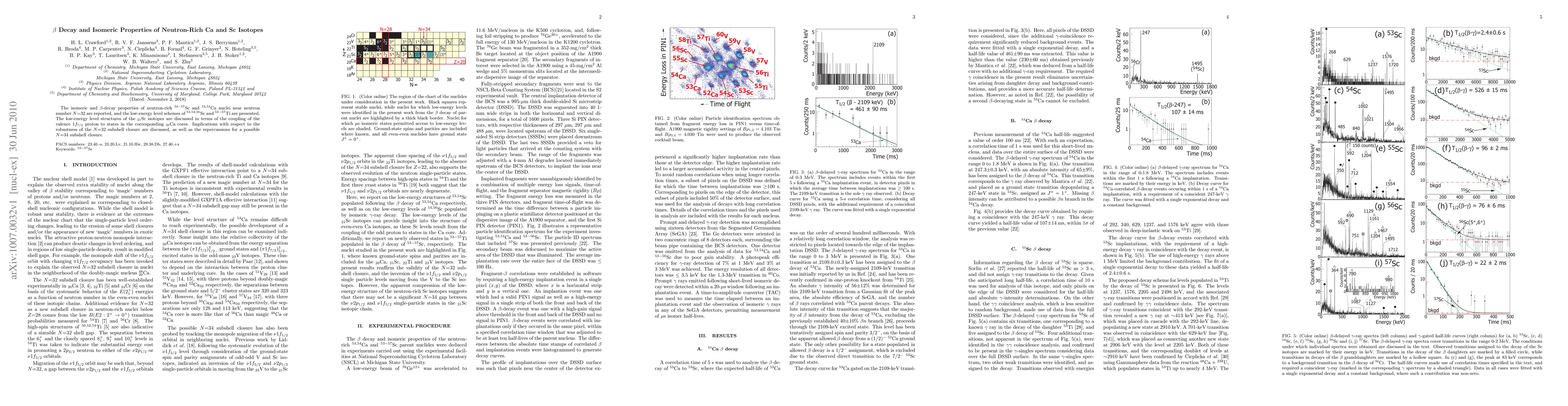 This study investigates the isomeric and $\beta$-decay properties of neutron-rich Sc and Ca isotopes near $N$=32, presenting low-energy level schemes for several isotopes. The findings discuss the coupling of the $1f_{7/2}$ proton and implications for the robustness of the $N$=32 subshell closure and potential $N$=34 subshell closure.