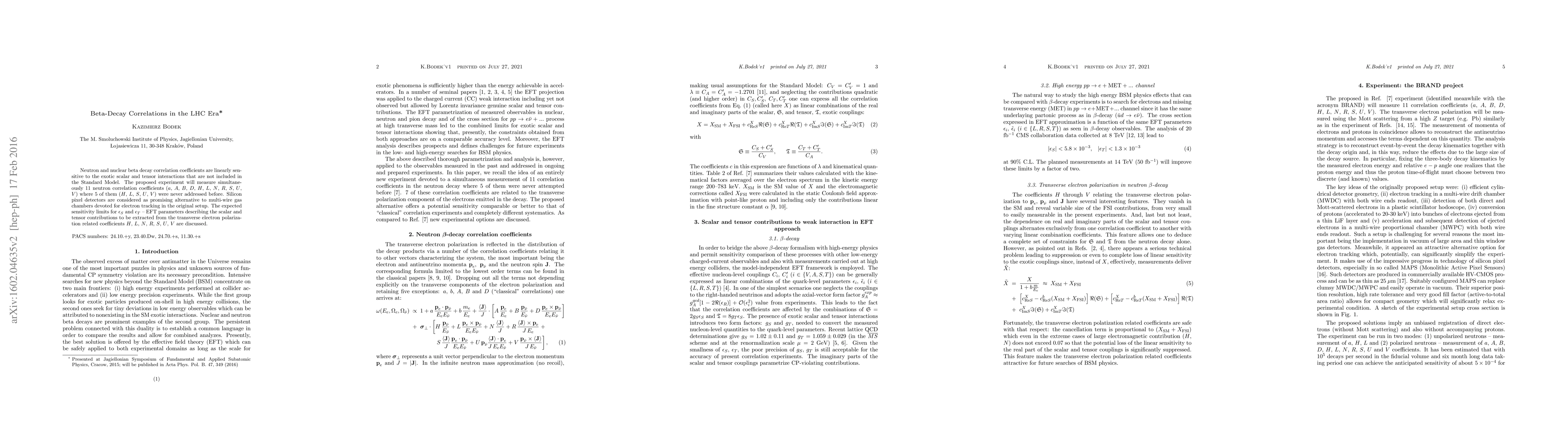 Neutron and nuclear beta decay correlation coefficients are linearly sensitive to the exotic scalar and tensor interactions that are not included in the Standard Model. The proposed experiment will measure simultaneously 11 neutron correlation coefficients ($a$, $A$, $B$, $D$, $H$, $L$, $N$, $R$, $S$, $U$, $V$) where 5 of them ($H$, $L$, $S$, $U$, $V$) were never addressed before. Silicon pixel detectors are considered as promising alternative to multi-wire gas chambers devoted for electron tracking in the original setup. The expected sensitivity limits for $\epsilon_S$ and $\epsilon_T$ -- EFT parameters describing the scalar and tensor contributions to be extracted from the transverse electron polarization related coefficients $H$, $L$, $N$, $R$, $S$, $U$, $V$ are discussed.