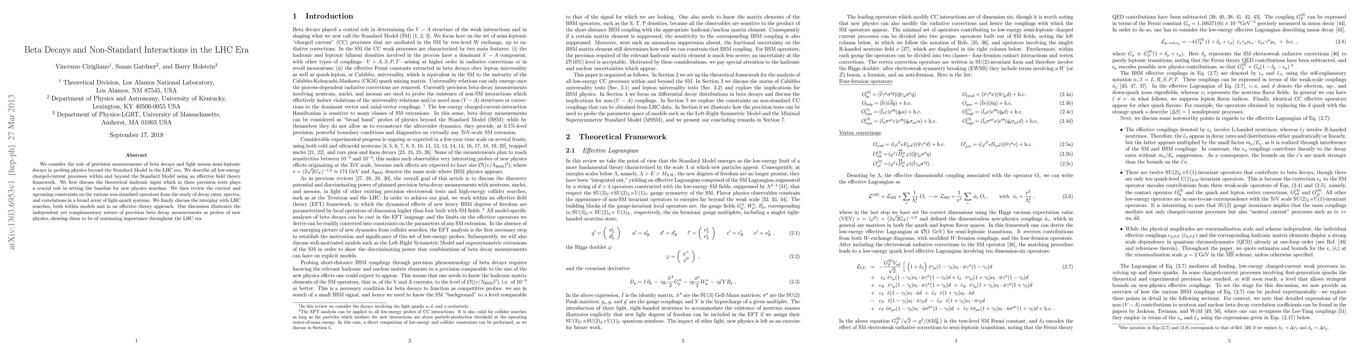 We consider the role of precision measurements of beta decays and light meson semi-leptonic decays in probing physics beyond the Standard Model in the LHC era. We describe all low-energy charged-current processes within and beyond the Standard Model using an effective field theory framework. We first discuss the theoretical hadronic input which in these precision tests plays a crucial role in setting the baseline for new physics searches. We then review the current and upcoming constraints on the various non-standard operators from the study of decay rates, spectra, and correlations in a broad array of light-quark systems. We finally discuss the interplay with LHC searches, both within models and in an effective theory approach. Our discussion illustrates the independent yet complementary nature of precision beta decay measurements as probes of new physics, showing them to be of continuing importance throughout the LHC era.
