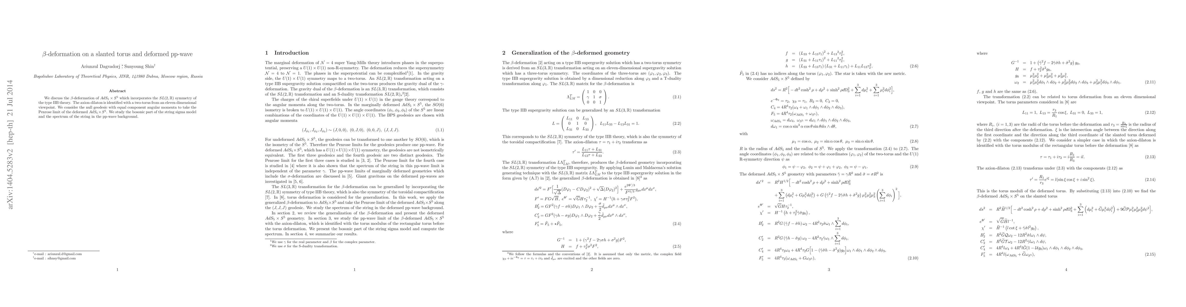 We discuss the $\beta$-deformation of $AdS_5\times S^5$ which incorporates the $SL(2,\mathbb{R})$ symmetry of the type IIB theory. The axion-dilaton is identified with a two-torus from an eleven dimensional viewpoint. We consider the null geodesic with equal component angular momenta to take the Penrose limit of the deformed $AdS_5\times S^5$. We study the bosonic part of the string sigma model and the spectrum of the string in the pp-wave background.
