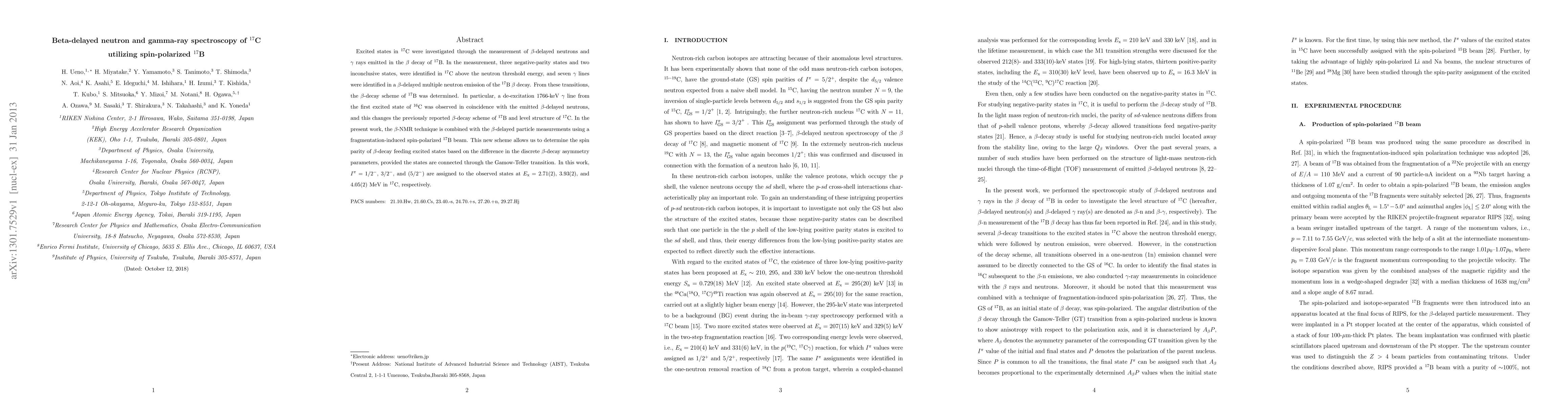 Researchers used a technique combining fibeta-NMR with particle measurements to study 17C's excited states after the decay of 17B. They identified three negative-parity states and two inconclusive states in 17C.