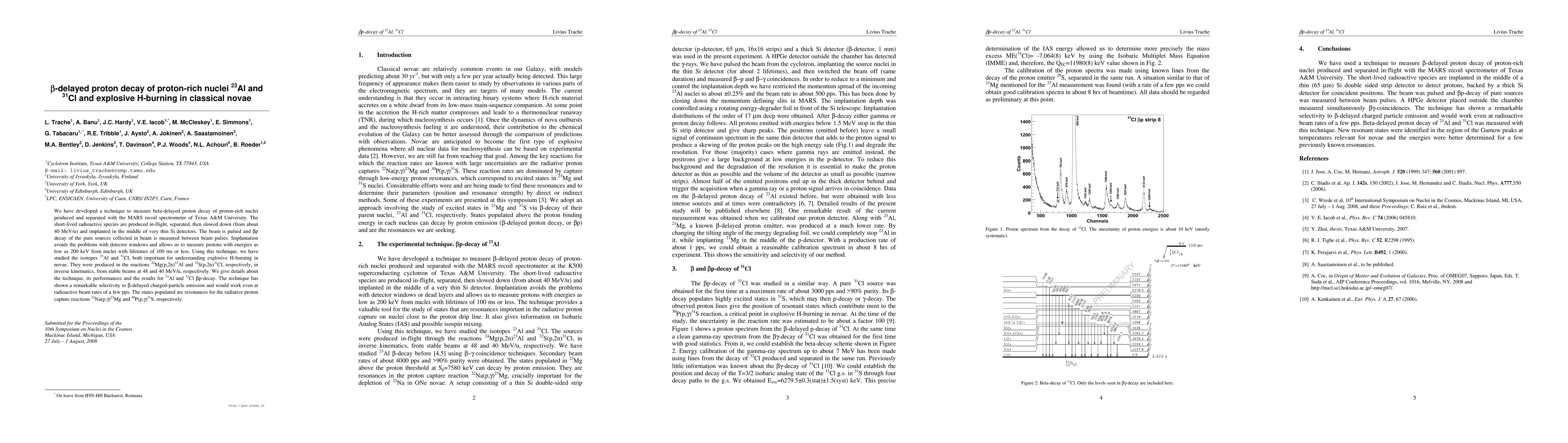 This research develops a novel technique to measure beta-delayed proton decay of short-lived, proton-rich nuclei 23Al and 31Cl, crucial for understanding explosive hydrogen burning in classical novae. The technique, using the MARS spectrometer, allows precise measurement of protons emitted from nuclei with lifetimes as short as 100 ms.