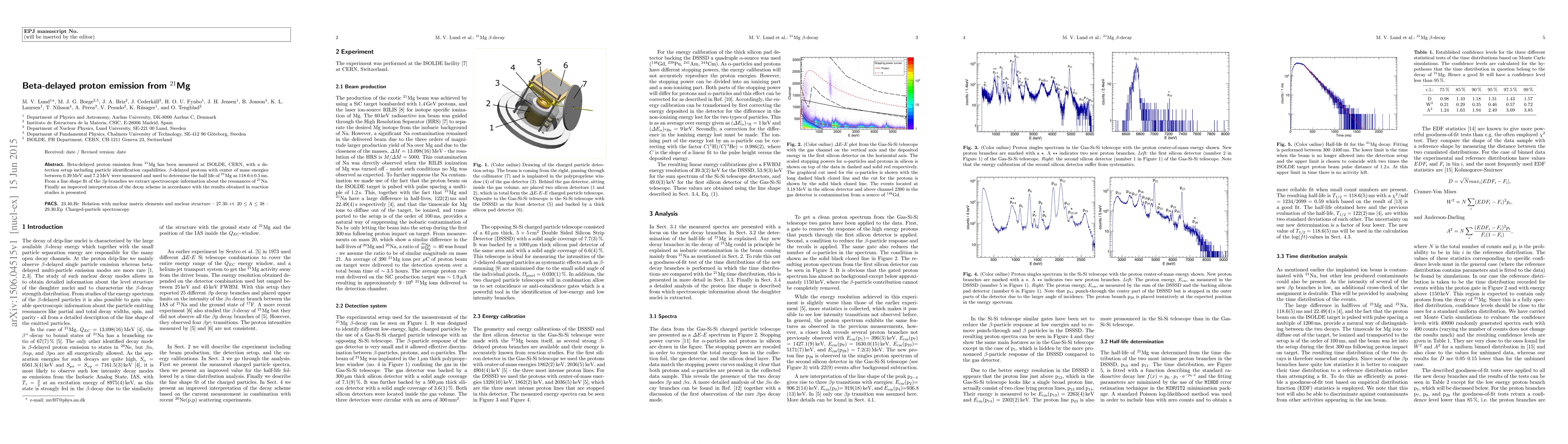 Beta-delayed proton emission from $^{21}$Mg has been measured at ISOLDE, CERN, with a detection setup including particle identification capabilities. $\beta$-delayed protons with center of mass energies between 0.39$\,$MeV and 7.2$\,$MeV were measured and used to determine the half life of $^{21}$Mg as $118.6\pm 0.5\,$ms. From a line shape fit of the $\beta p$ branches we extract spectroscopic information about the resonances of $^{21}$Na. Finally an improved interpretation of the decay scheme in accordance with the results obtained in reaction studies is presented.