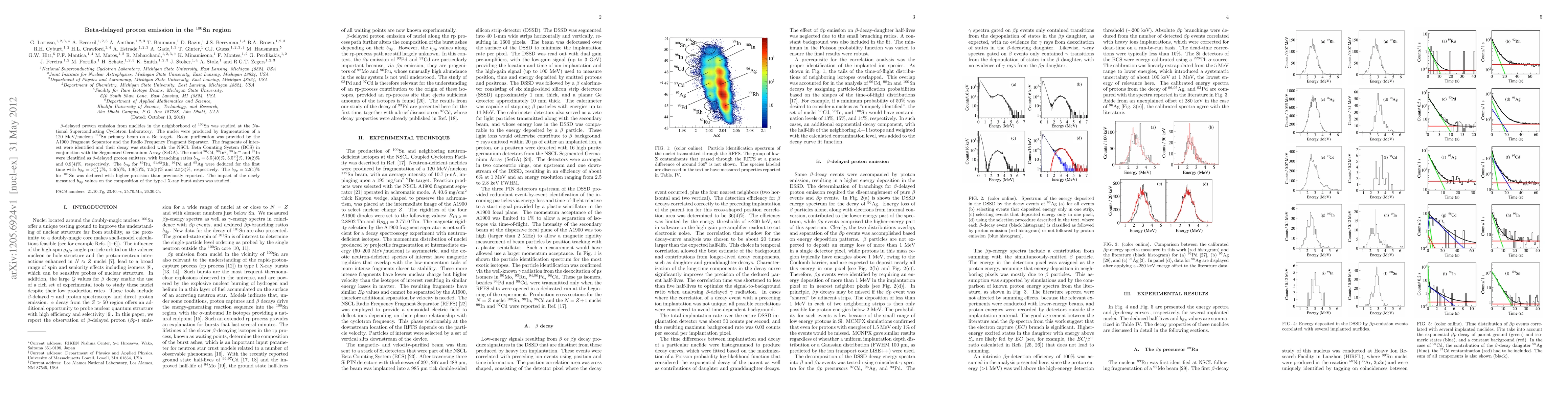 Beta-delayed proton emission from nuclides in the neighborhood of 100Sn was studied at the National Superconducting Cyclotron Laboratory. The nuclei were produced by fragmentation of a 120 MeV/nucleon 112Sn primary beam on a Be target. Beam purification was provided by the A1900 Fragment Separator and the Radio Frequency Fragment Separator. The fragments of interest were identified and their decay was studied with the NSCL Beta Counting System (BCS) in conjunction with the Segmented Germanium Array (SeGA). The nuclei 96Cd, 98Ing, 98Inm and 99In were identified as beta-delayed proton emitters, with branching ratios bp = 5.5(40)%, 5.5+3 -2%, 19(2)% and 0.9(4)%, respectively. The bp for 89Ru, 91,92Rh, 93Pd and 95Ag were deduced for the first time with bp = 3+1.9 -1.7%, 1.3(5)%, 1.9(1)%, 7.5(5)% and 2.5(3)%, respectively. The bp = 22(1)% for 101Sn was deduced with higher precision than previously reported. The impact of the newly measured bp values on the composition of the type-I X-ray burst ashes was studied.
