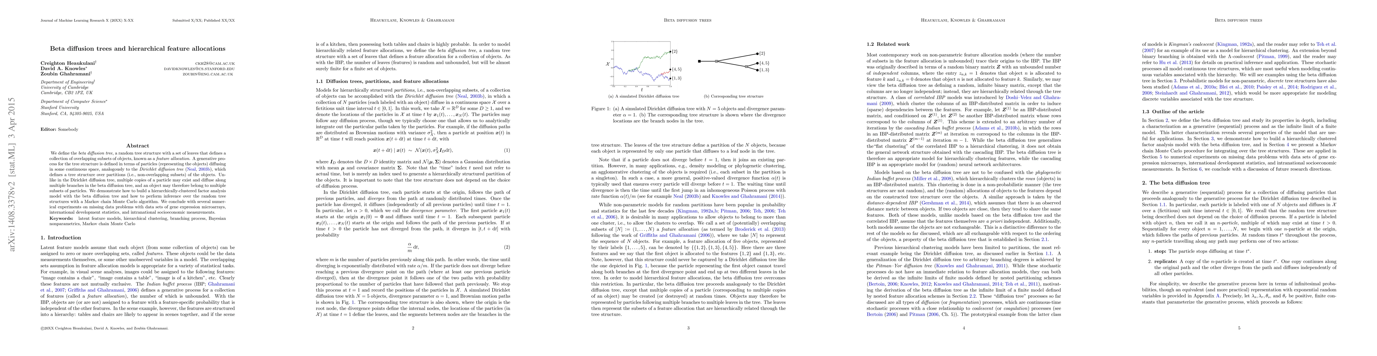 We define the beta diffusion tree, a random tree structure with a set of leaves that defines a collection of overlapping subsets of objects, known as a feature allocation. A generative process for the tree structure is defined in terms of particles (representing the objects) diffusing in some continuous space, analogously to the Dirichlet diffusion tree (Neal, 2003), which defines a tree structure over partitions (i.e., non-overlapping subsets) of the objects. Unlike in the Dirichlet diffusion tree, multiple copies of a particle may exist and diffuse along multiple branches in the beta diffusion tree, and an object may therefore belong to multiple subsets of particles. We demonstrate how to build a hierarchically-clustered factor analysis model with the beta diffusion tree and how to perform inference over the random tree structures with a Markov chain Monte Carlo algorithm. We conclude with several numerical experiments on missing data problems with data sets of gene expression microarrays, international development statistics, and intranational socioeconomic measurements.