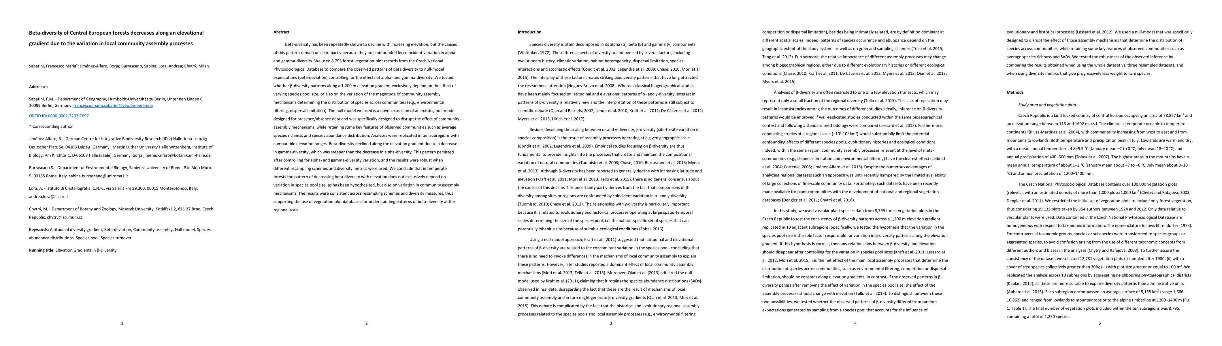 Beta-diversity has been repeatedly shown to decline with increasing elevation, but the causes of this pattern remain unclear, partly because they are confounded by coincident variation in alpha- and gamma-diversity. We used 8,795 forest vegetation-plot records from the Czech National Phytosociological Database to compare the observed patterns of beta diversity to null-model expectations (beta-deviation) controlling for the effects of alpha- and gamma-diversity. We tested whether \b{eta}-diversity patterns along a 1,200 m elevation gradient exclusively depend on the effect of varying species pool size, or also on the variation of the magnitude of community assembly mechanisms determining the distribution of species across communities (e.g., environmental filtering, dispersal limitation). The null model we used is a novel extension of an existing null-model designed for presence/absence data and was specifically designed to disrupt the effect of community assembly mechanisms, while retaining some key features of observed communities such as average species richness and species abundance distribution. Analyses were replicated in ten subregions with comparable elevation ranges. Beta-diversity declined along the elevation gradient due to a decrease in gamma-diversity, which was steeper than the decrease in alpha-diversity. This pattern persisted after controlling for alpha- and gamma-diversity variation, and the results were robust when different resampling schemes and diversity metrics were used. We conclude that in temperate forests the pattern of decreasing beta-diversity with elevation does not exclusively depend on variation in species pool size, as has been hypothesized, but also on variation in community assembly mechanisms. The results were consistent across resampling schemes and diversity measures, thus supporting the use of vegetation plot databases for understanding...