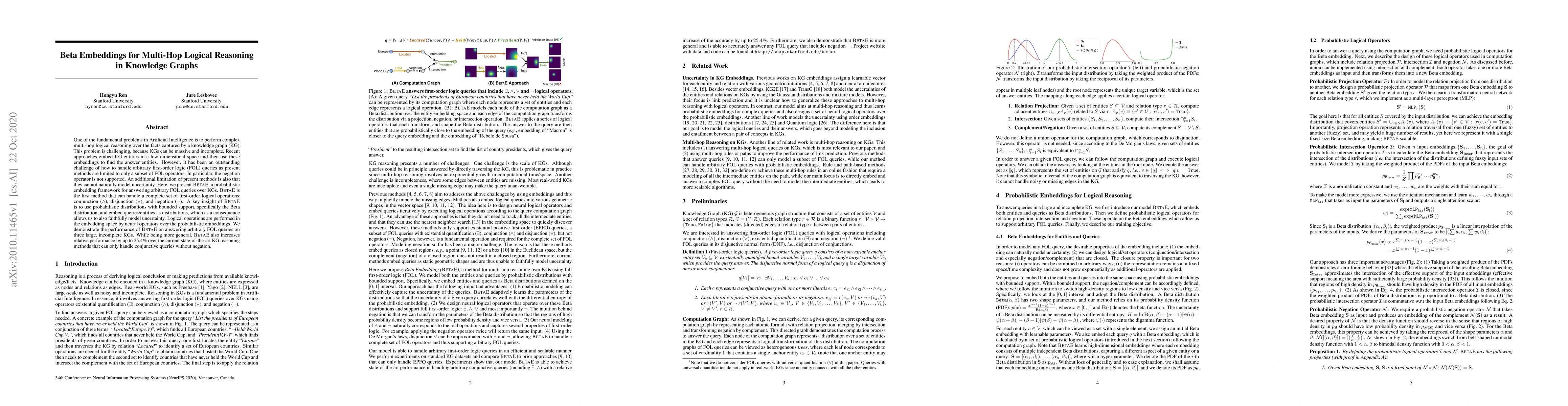 BetaE, a new probabilistic embedding framework, enables answering arbitrary multi-hop logical reasoning queries in knowledge graphs with up to 25.4% relative performance improvement.